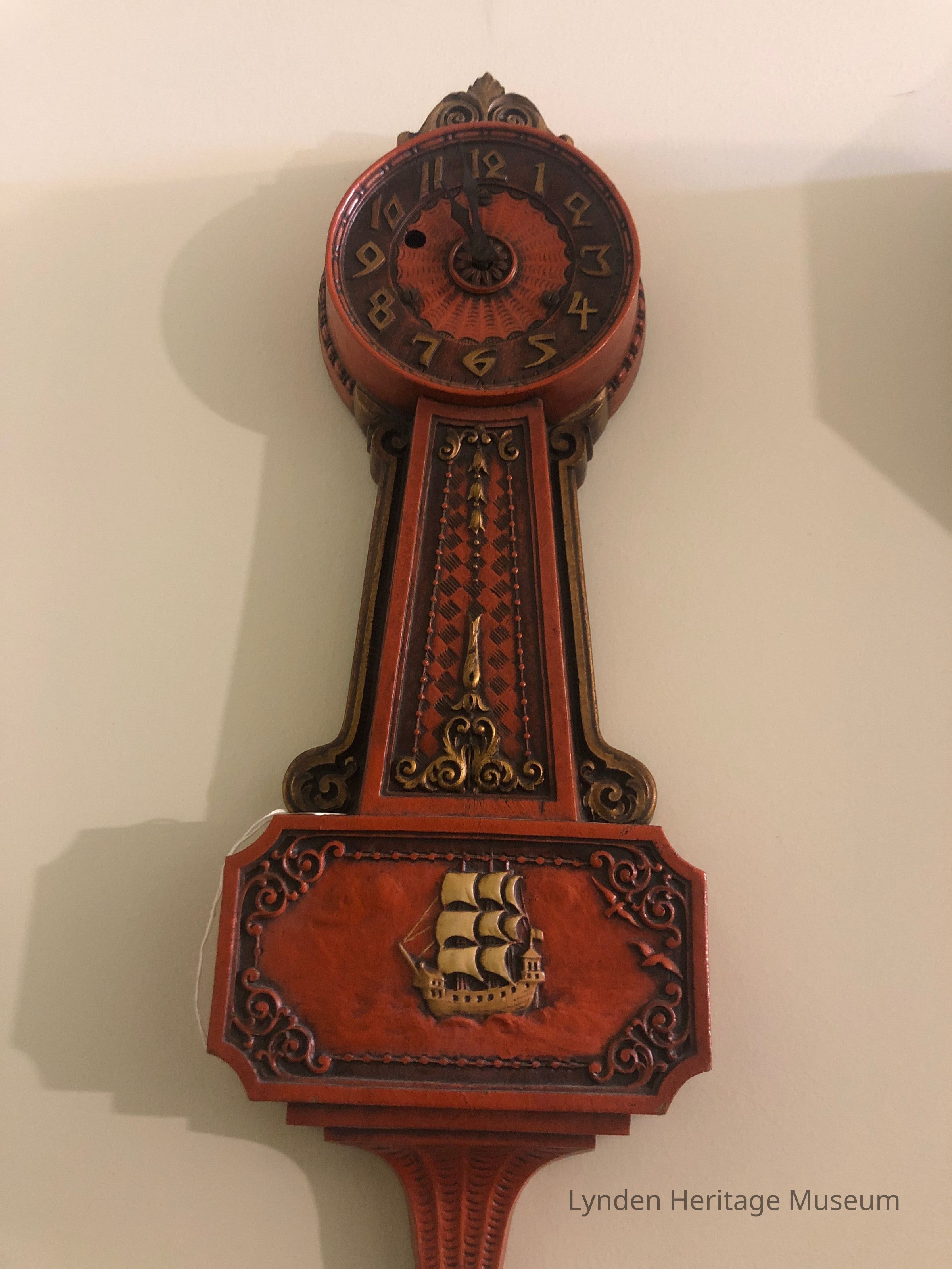 Red with decorative design. Gold detailing with ship below.