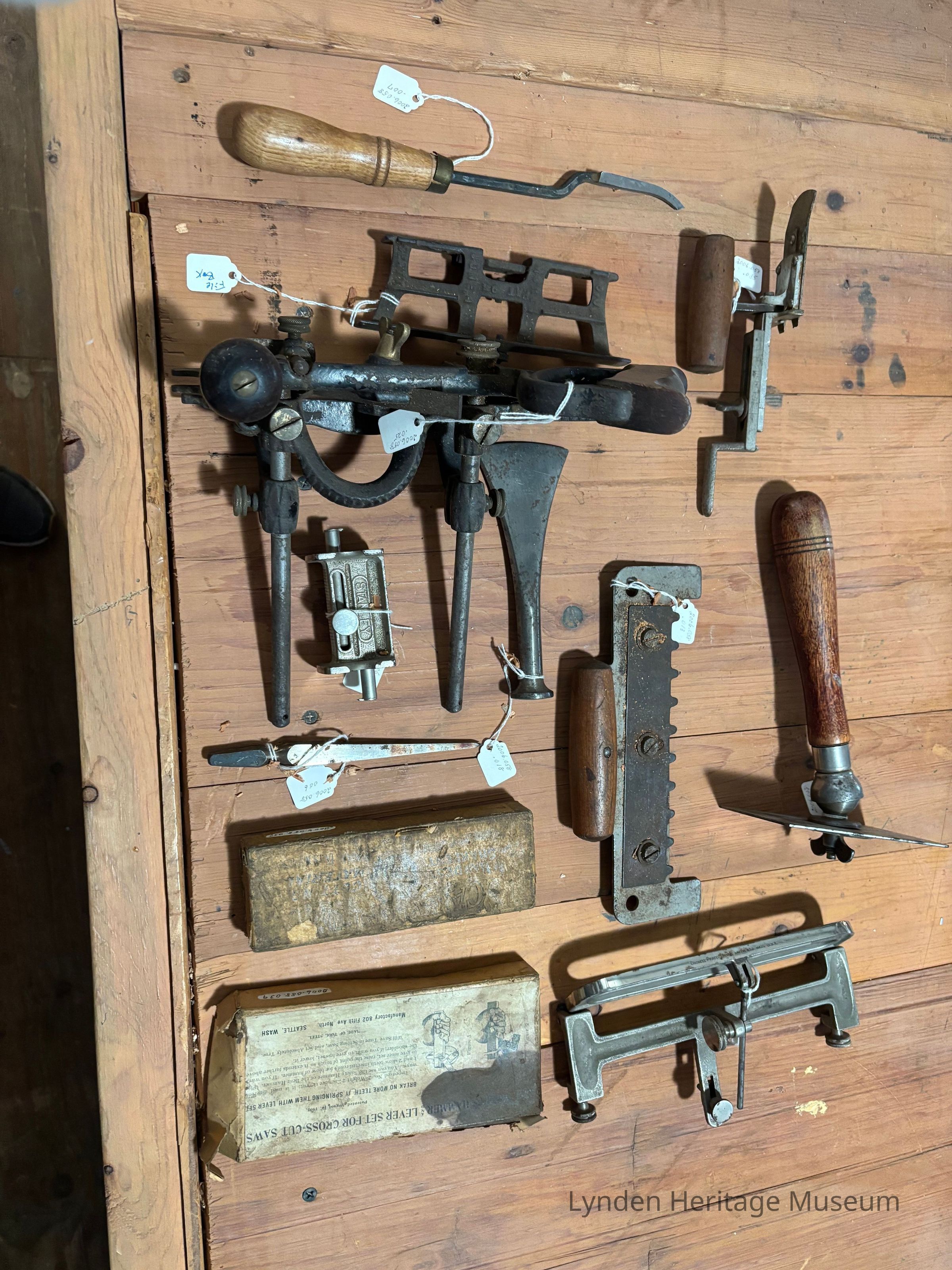 2006.058.039 - S.J. Morin's hammer and lever set for crosscut saws box topAcquisition