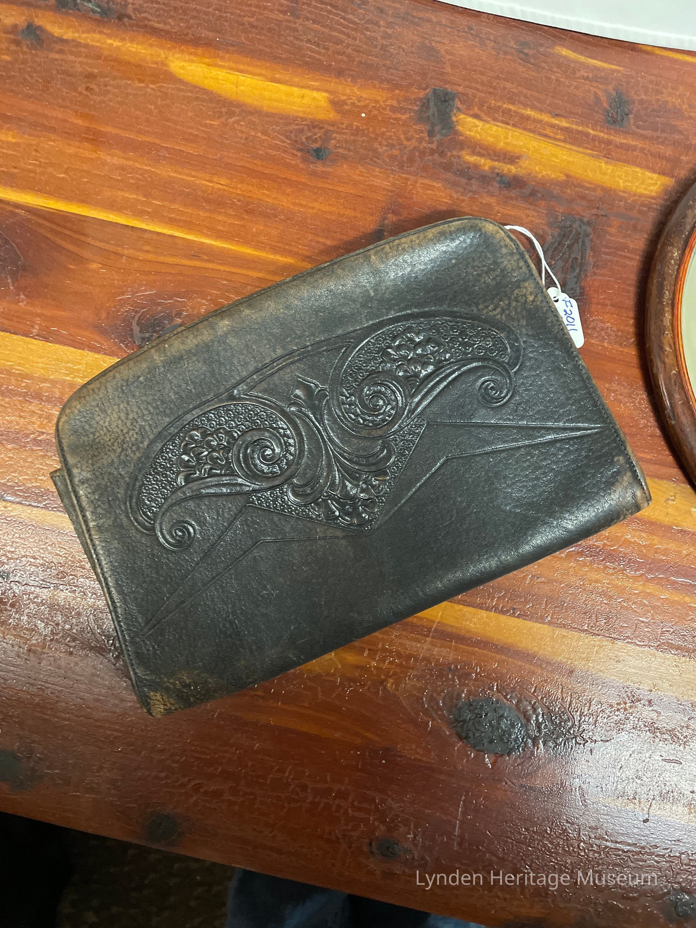 Detailed on front, zips closed, green inside, leather