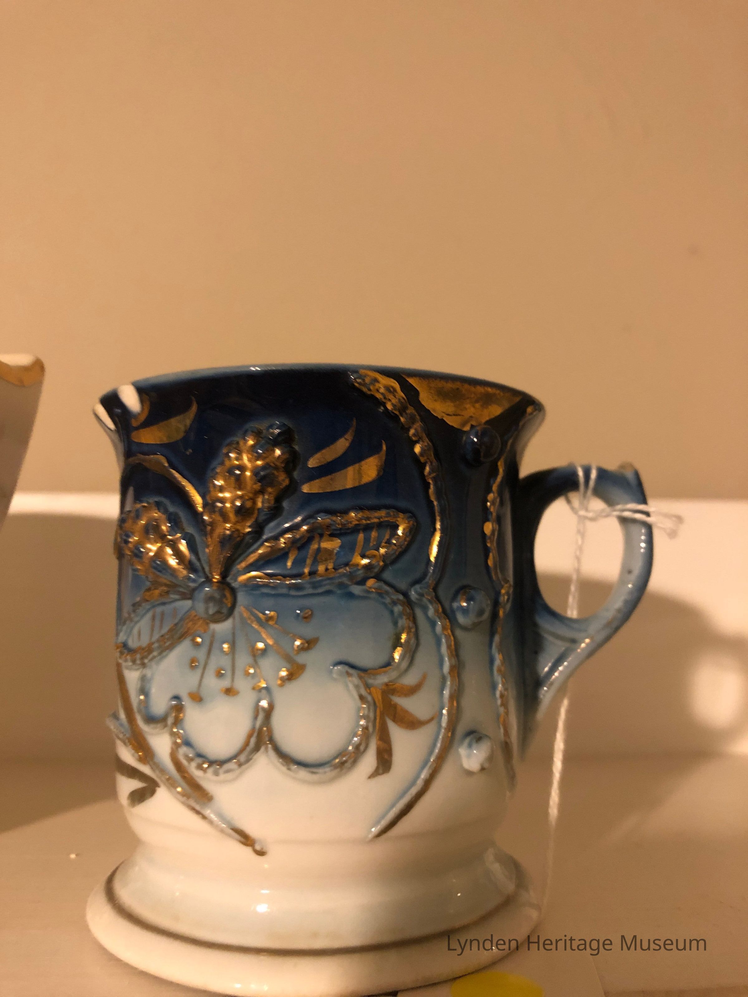Mug features an ombré of blue to white. Decorative floral designs in gold.