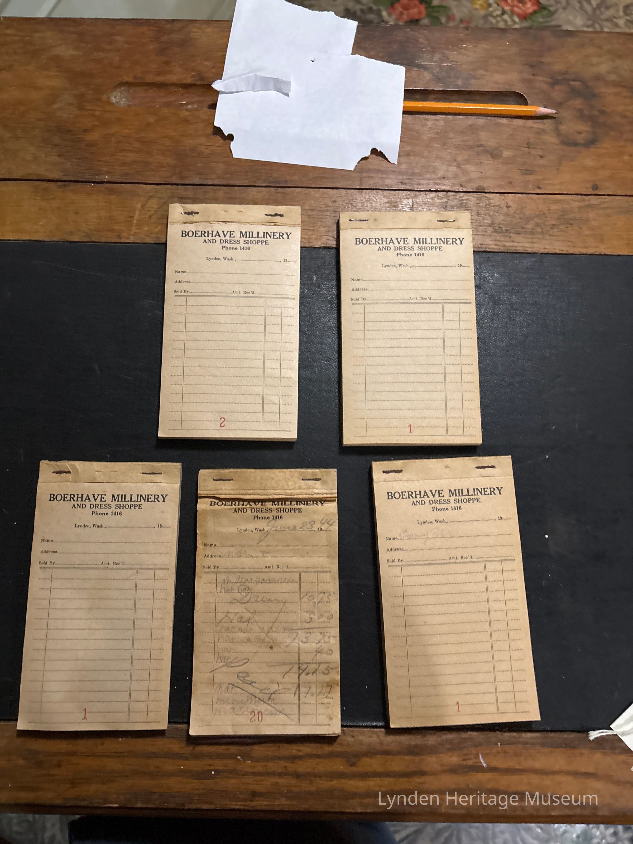Five Order Books. Top two and bottom left booklets have no markings. The two on the bottom right are marked.