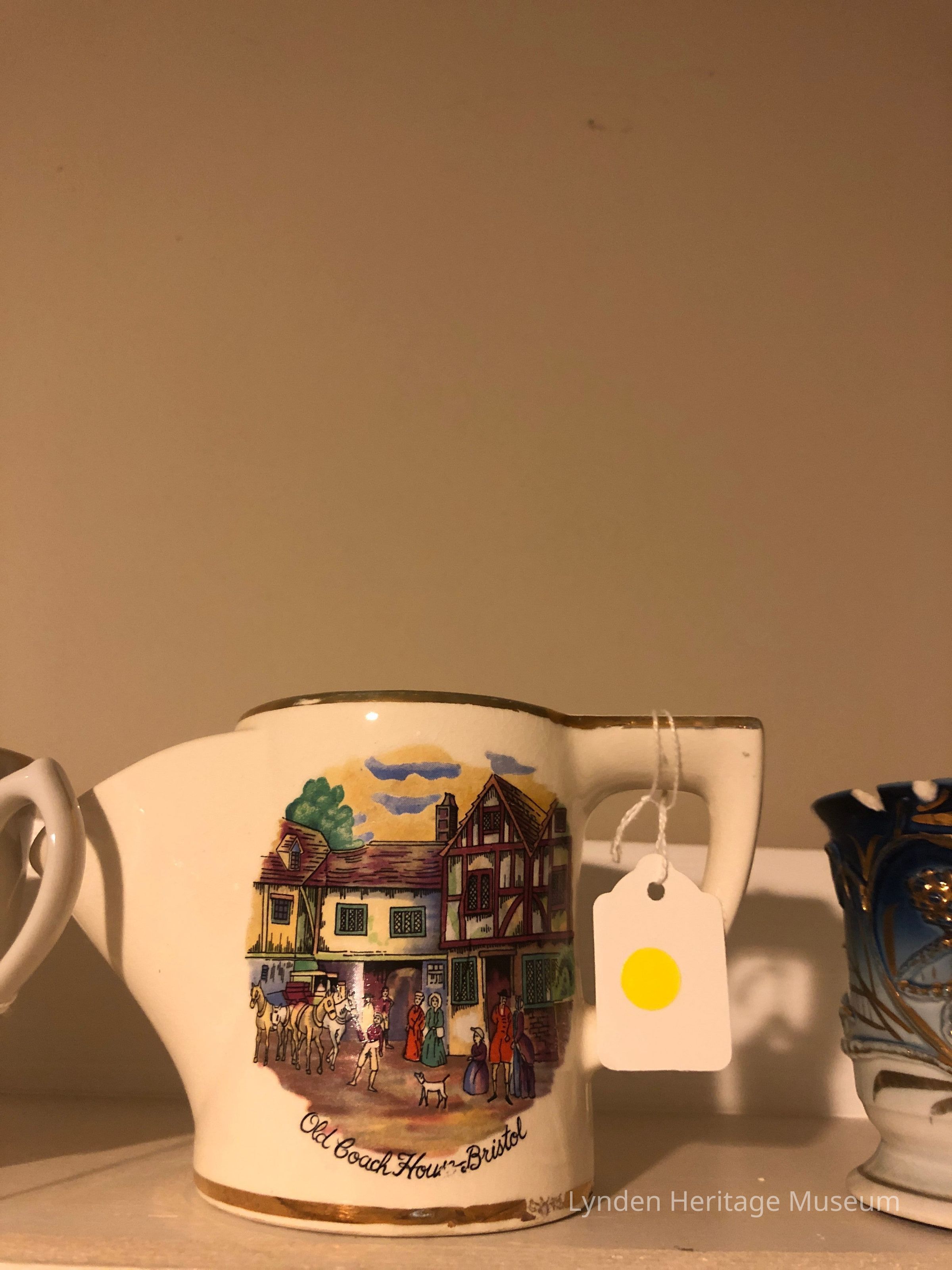 Wide white mug. Face of mug features illustration of village. Mug has a spout at end.
