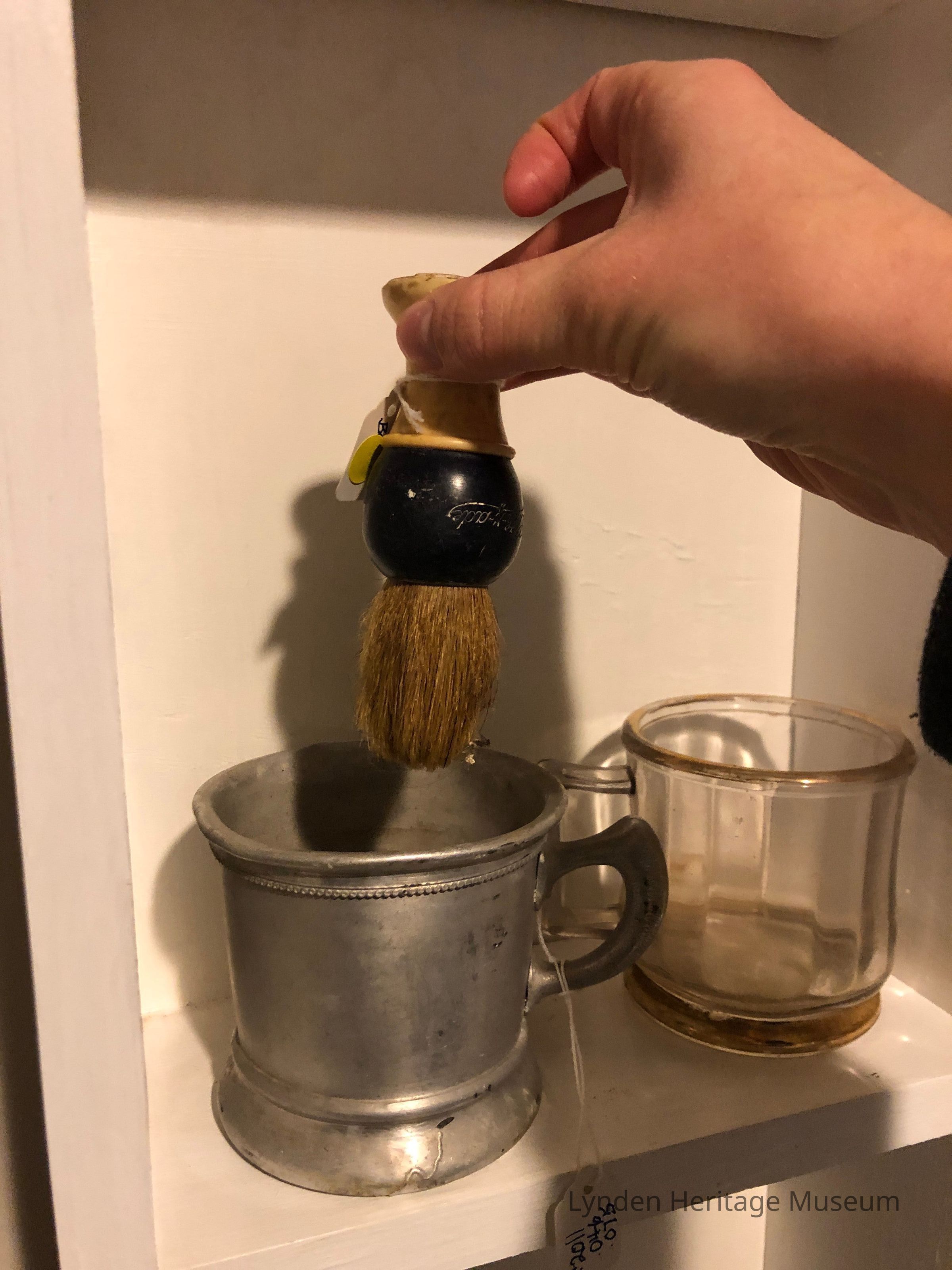 Brush contains brown bristles. Body includes black round frame and yellow handle.