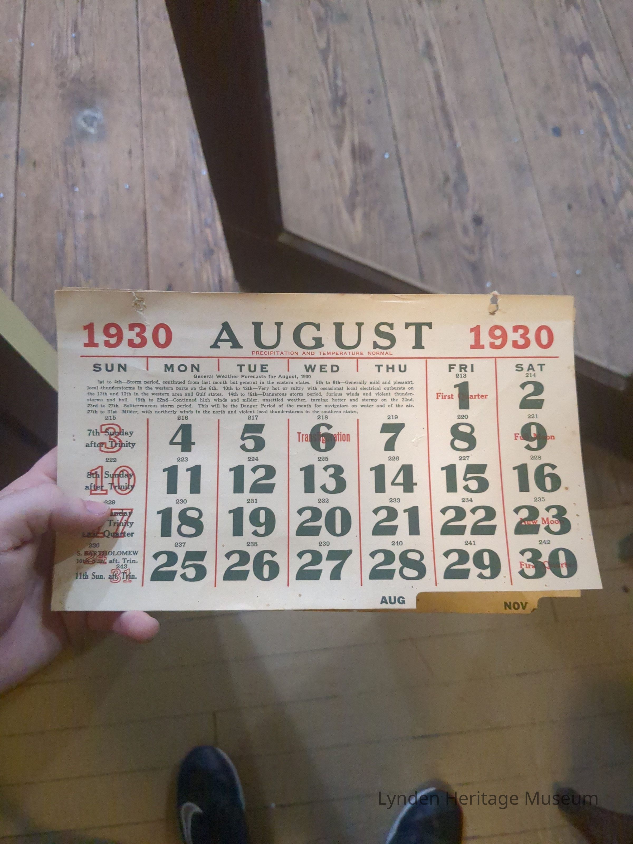 Contains two sections of a calendar from 1930 for the months of August and November.