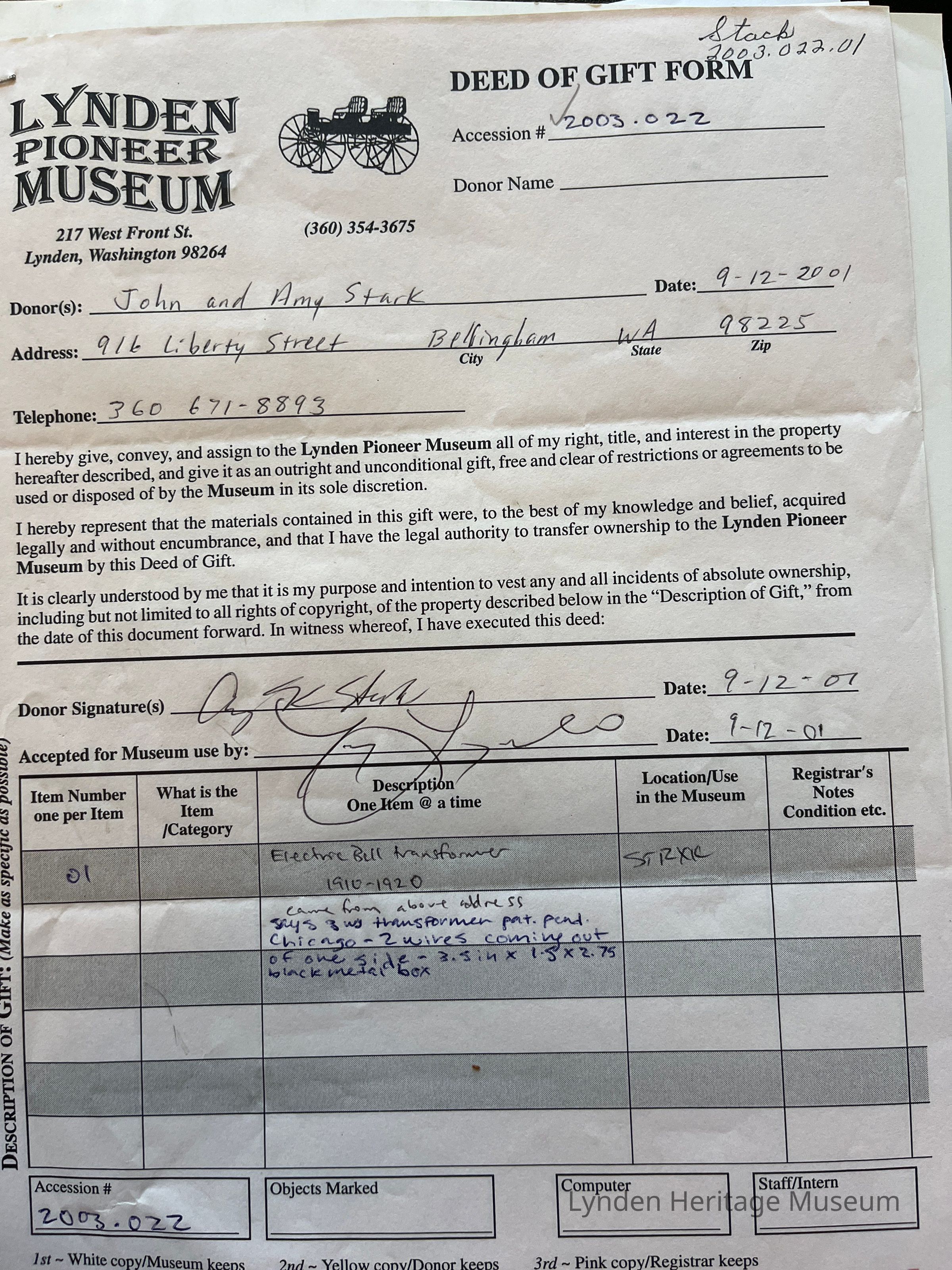 Electric Bill Transformer 1910-1920, came from address on form. Donors stated (unintelligible)