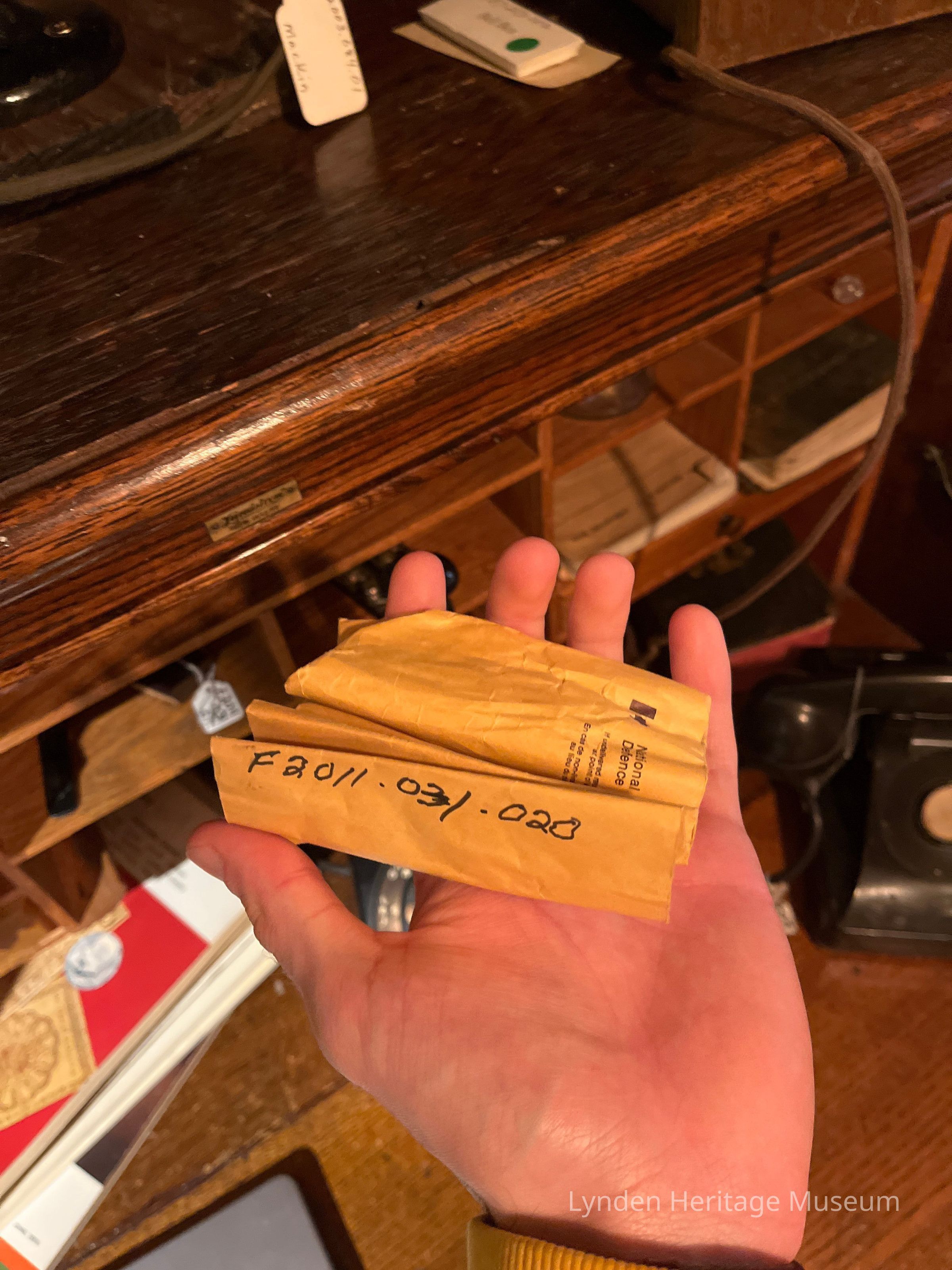 Various screws of different sizes and types some with counterparts some standalone In a rolled up envelope stamped Canada on one side and Nation Defense on the other