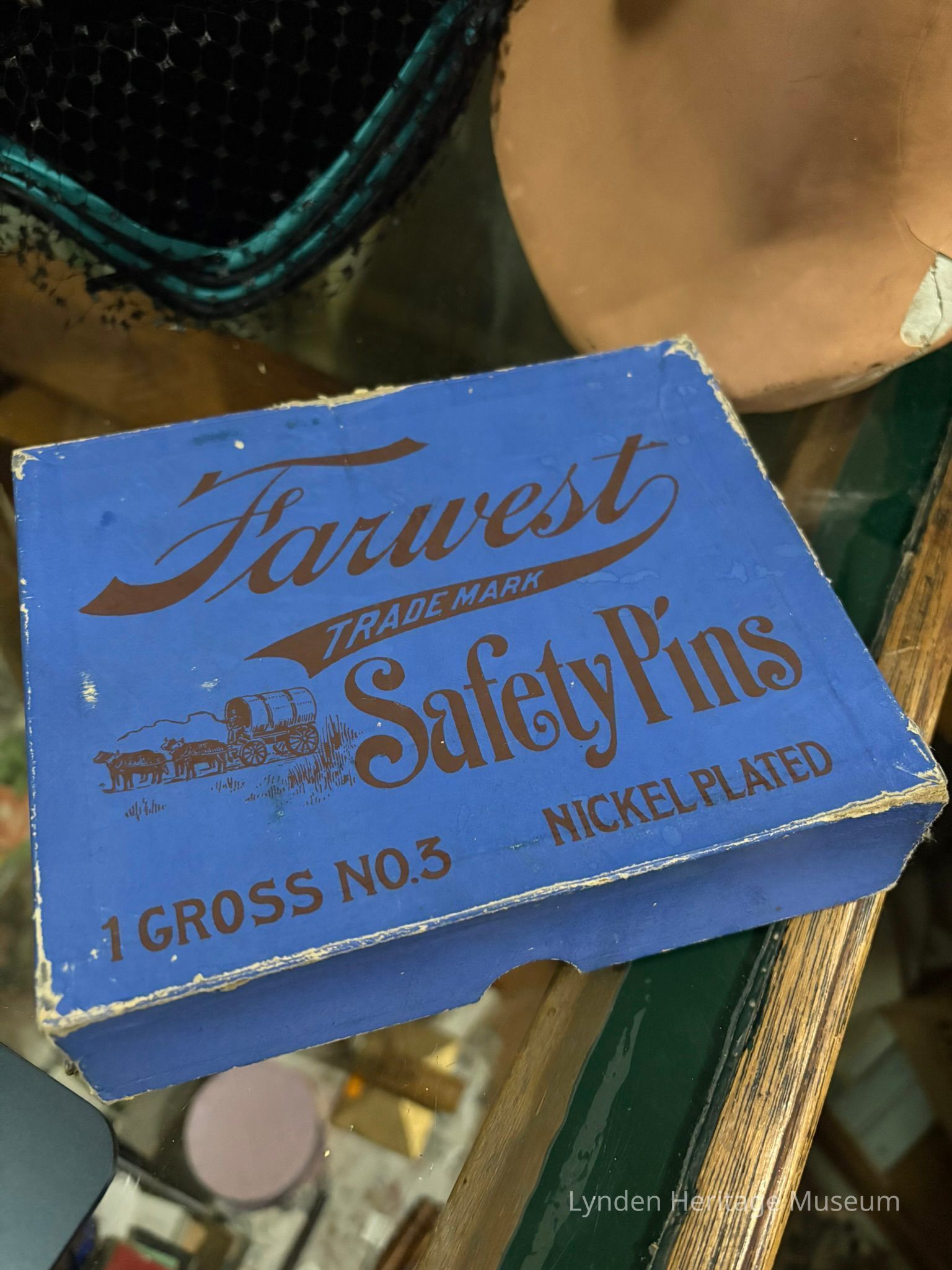Blue box with brown text that states " Farwest Trade Mark Safety Pins". Box is worn on edges.Category