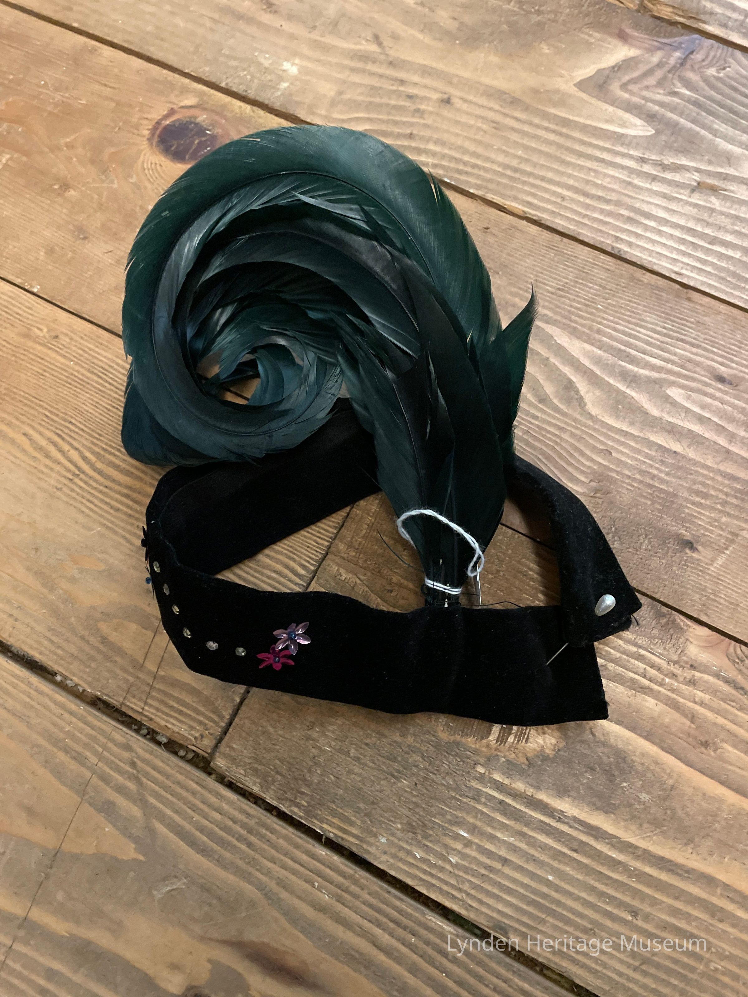 Green feather attached to black velvet headpiece with floral design, held together by pearl pin.
