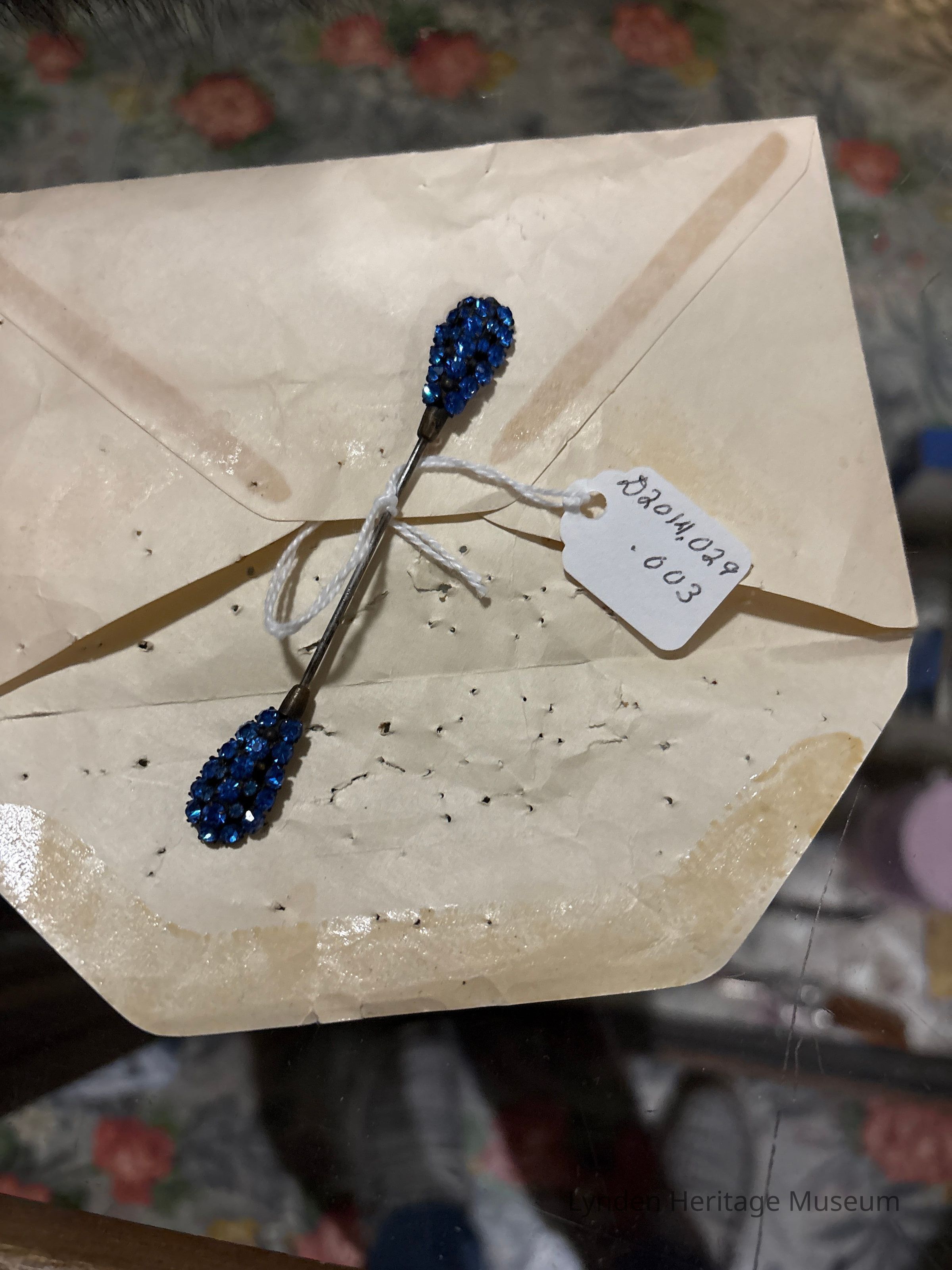Hair pin with blue beads on both ends. Found inside envelope labeled with accession number 2014.029.004.