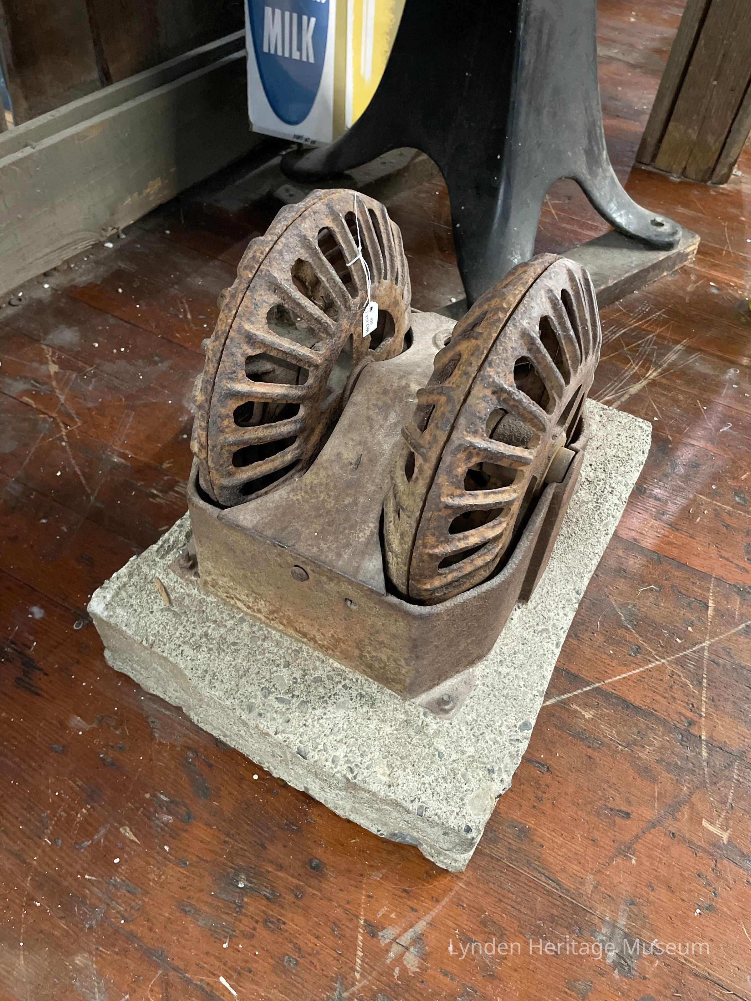 Hog oiler with rusty wheels and a large cement base