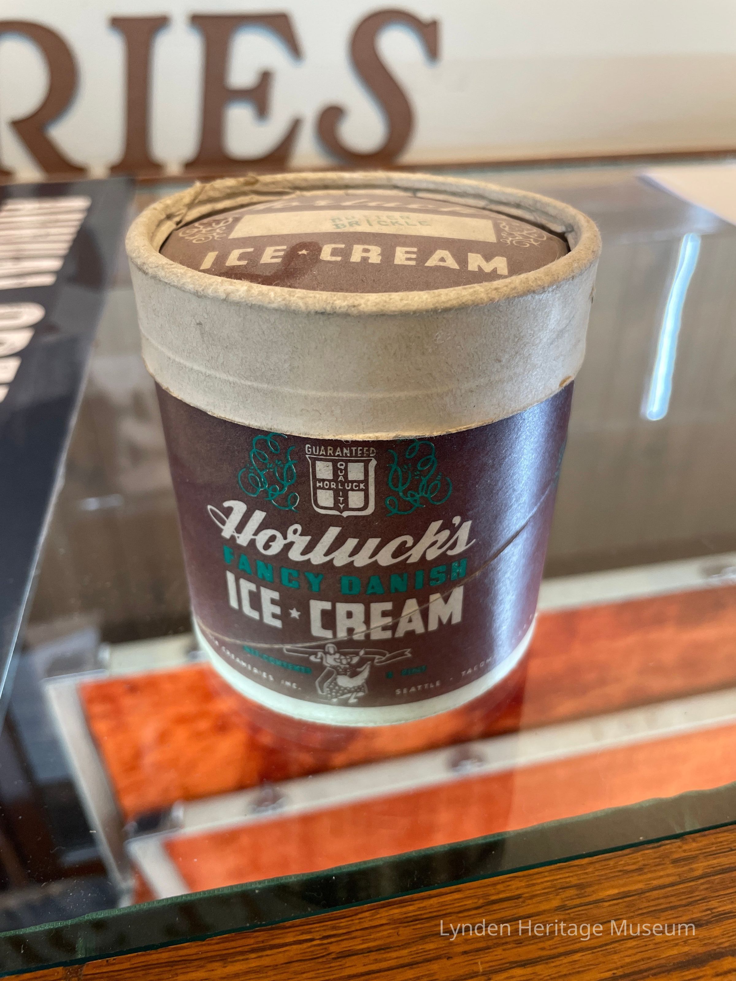Reddish brown ice cream container, Horluck’s brand