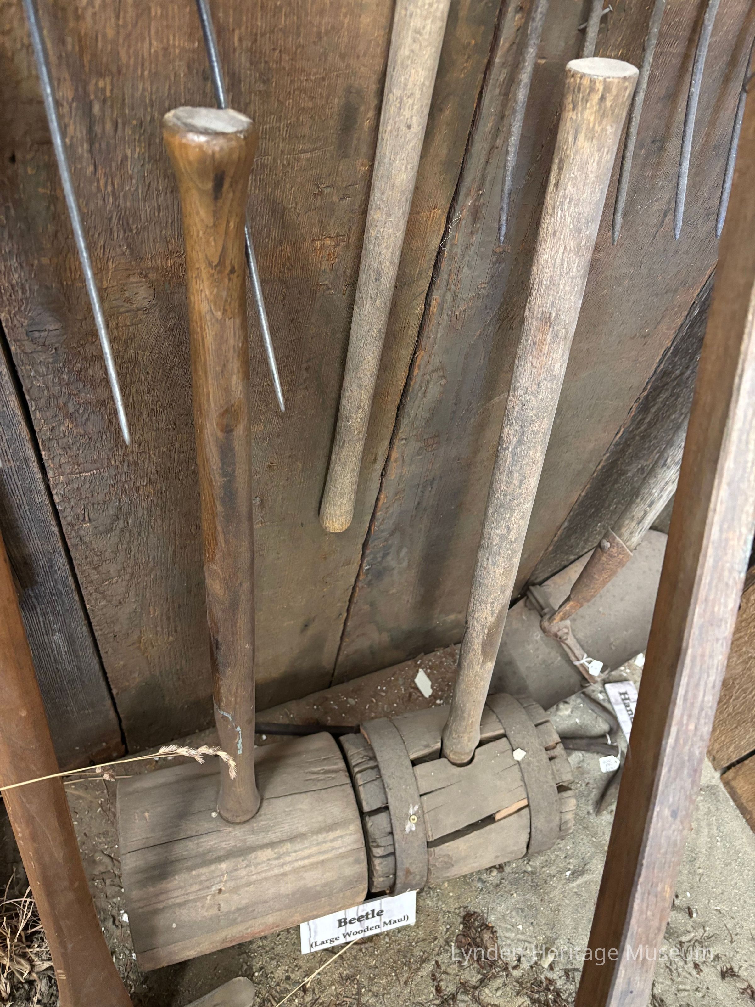 2025.022.022 - Large wooden maul that resembles barrel 2025.022.023 - Large wooden maul