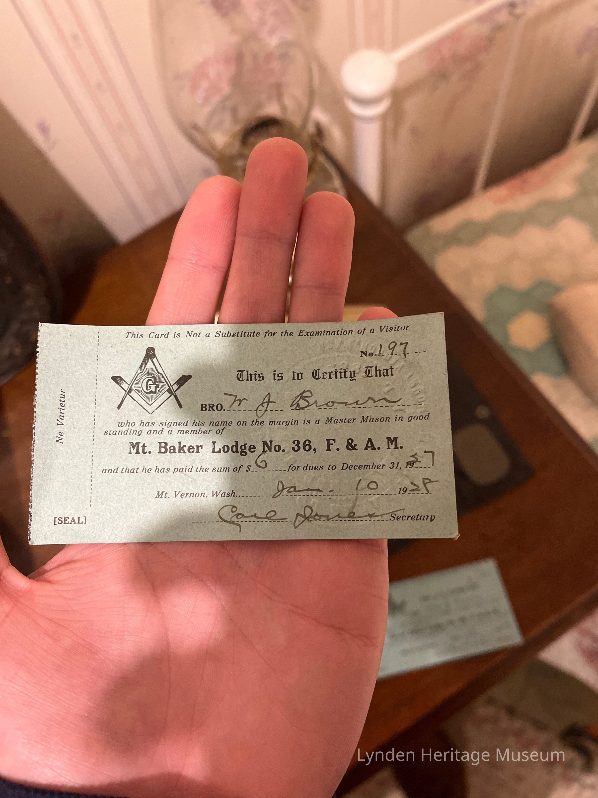 Gift from Gerald Nelson ? F. & A.M. Lodge chapter card receipt Has the name W.J. Brown on it