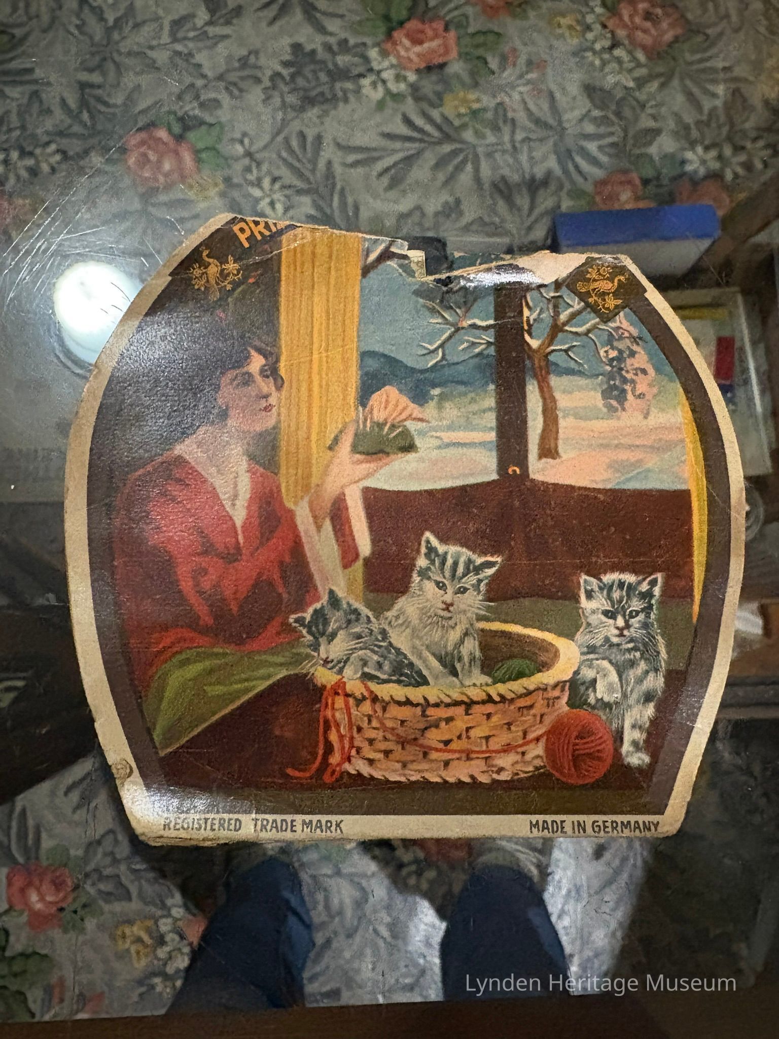Front of item includes illustration of a woman and cats. Back features illustration of two women with one riding a horse and the other in a red car. Inside includes four needle holders and below includes six needes straped to the material. Made in Germany.Acquisition