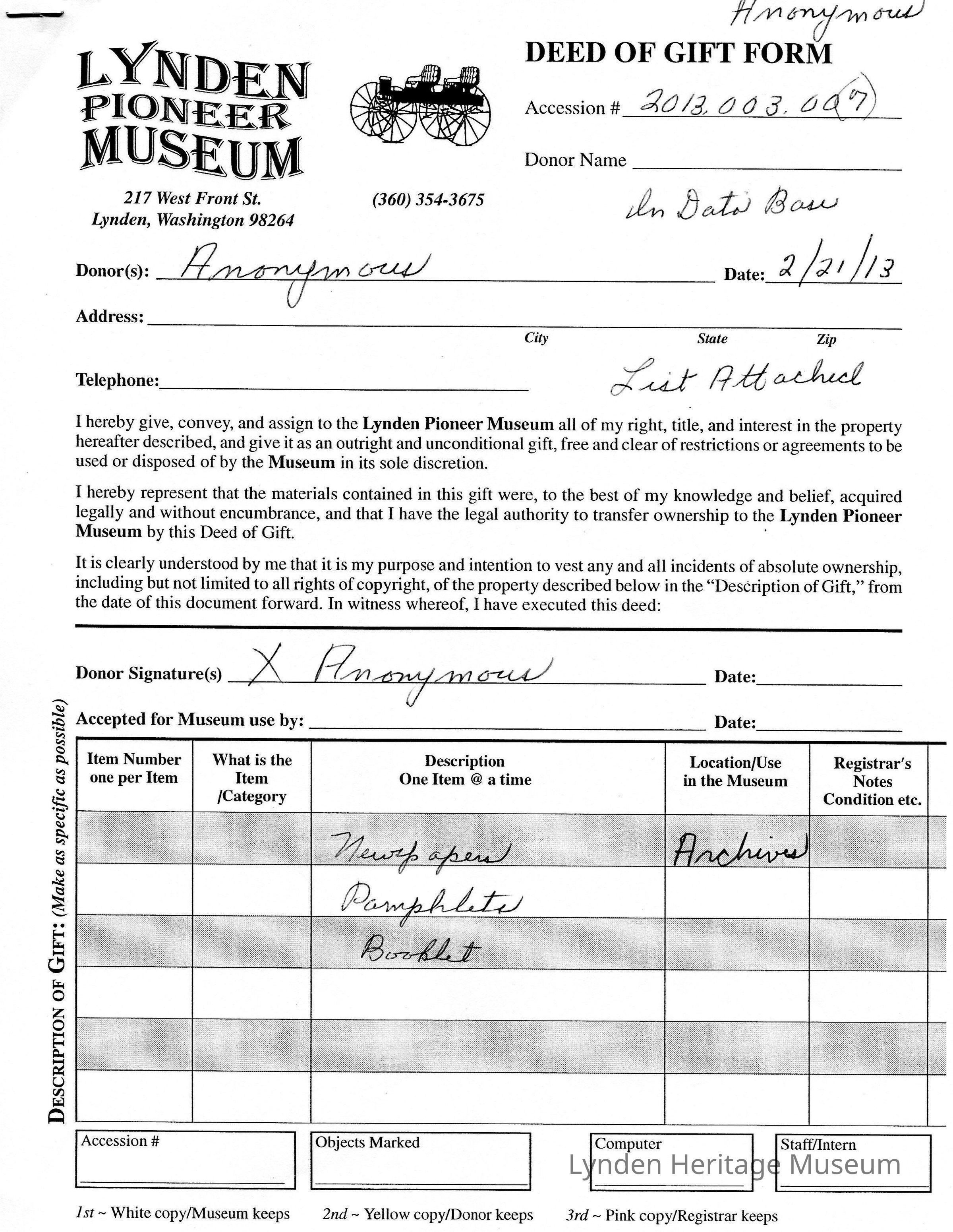 Unknown what printed material included in donation