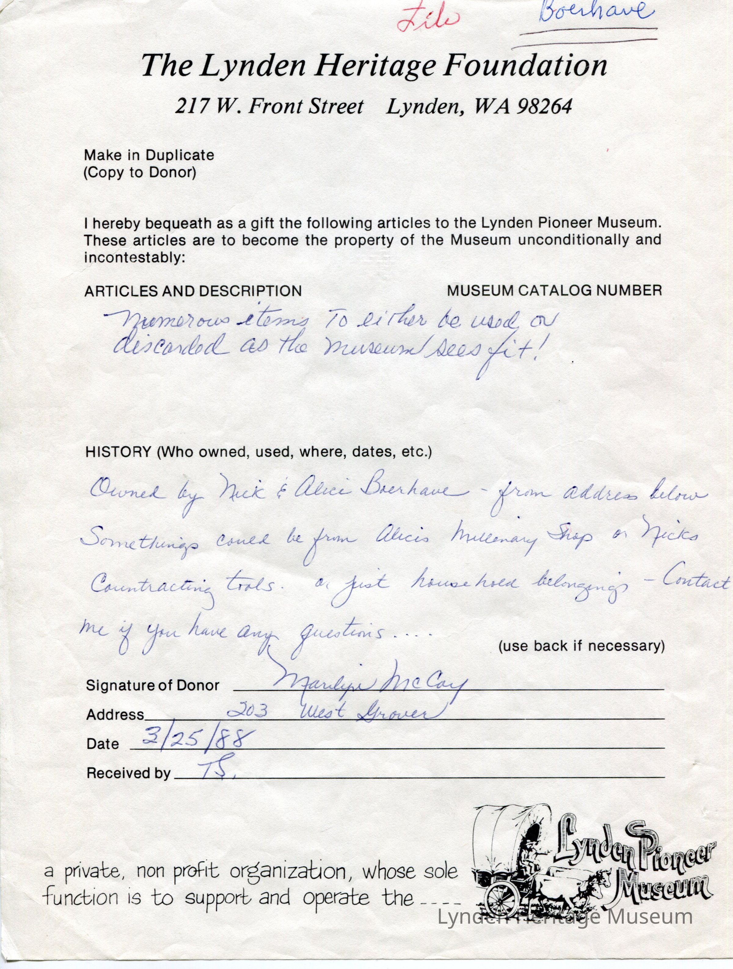 Owned by Nick and Alice Boerhave from address below. Some things could be from Alice Mullinary Shop or Nicks contracting tools or just household belongings. Contact me if you have questions.Acquisition