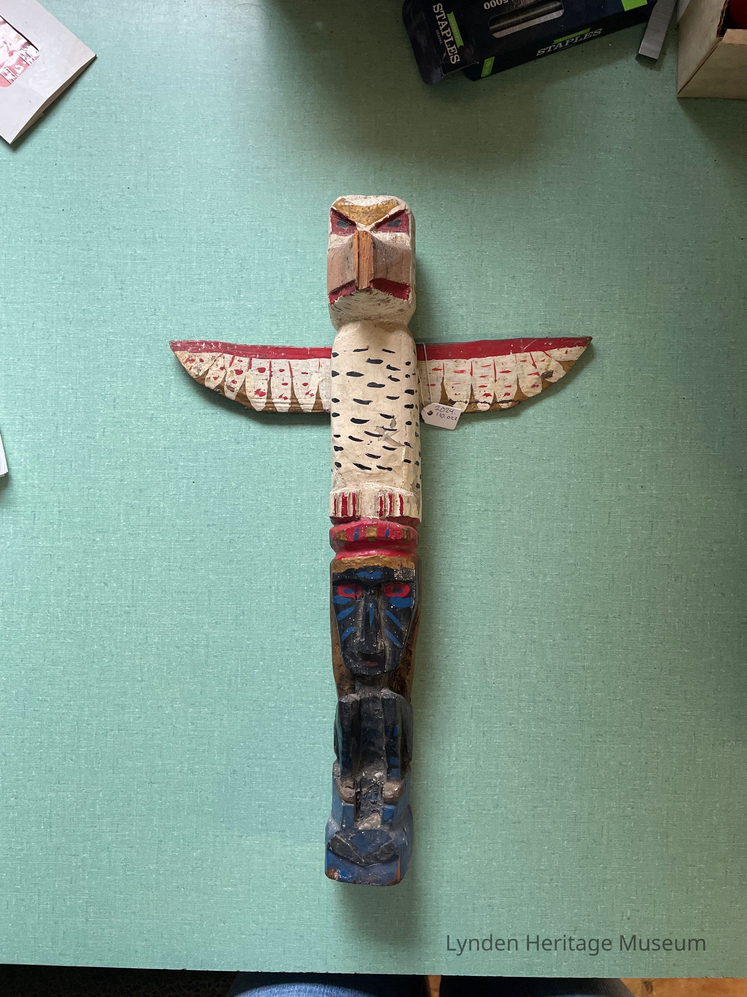 Painted wooden totem pole w/ white eagle & black/blue person 15” tall & 2.2” wideContext
