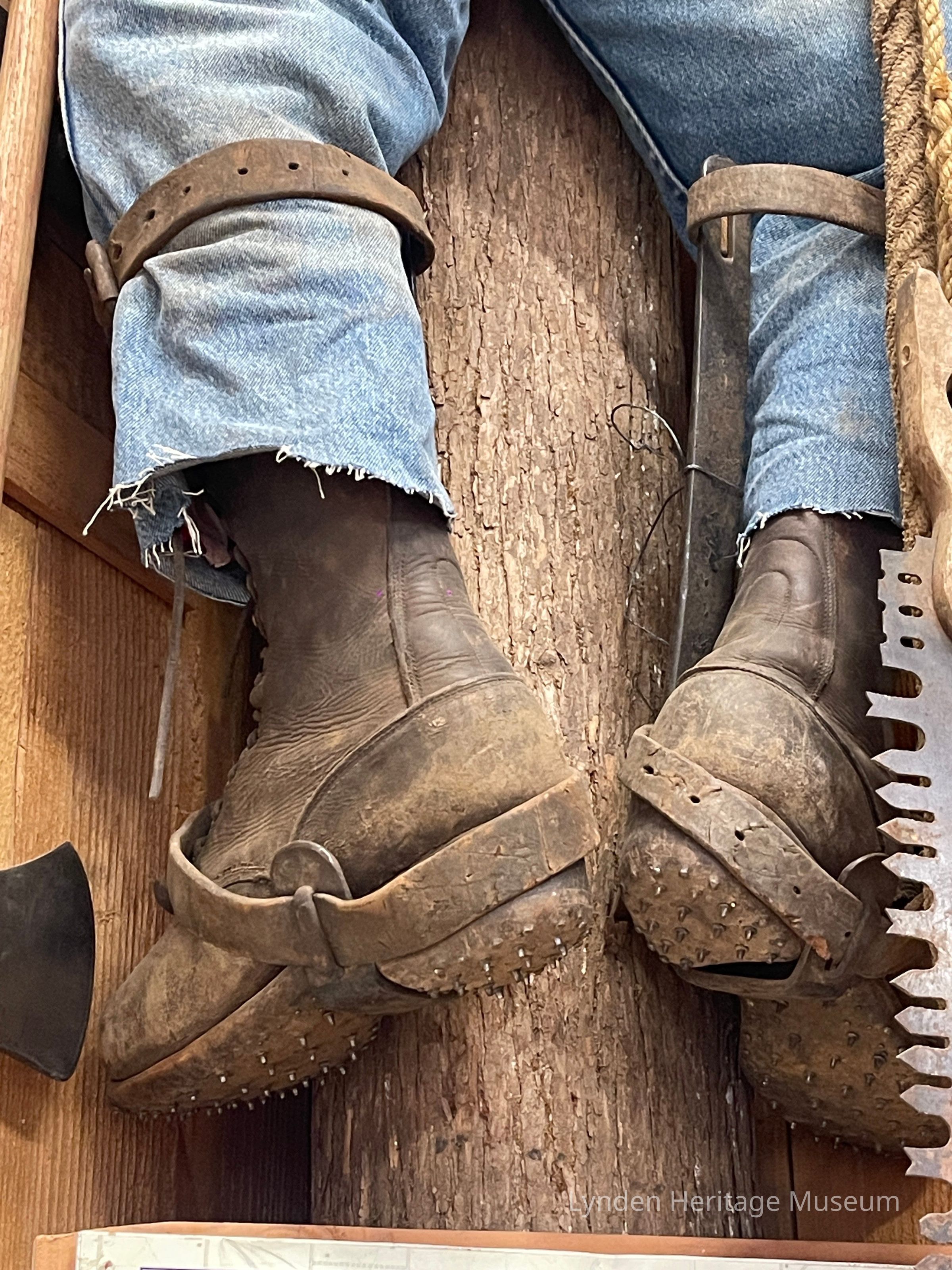 The metal and leather harnesses that go around the spiked logging boots of a climber