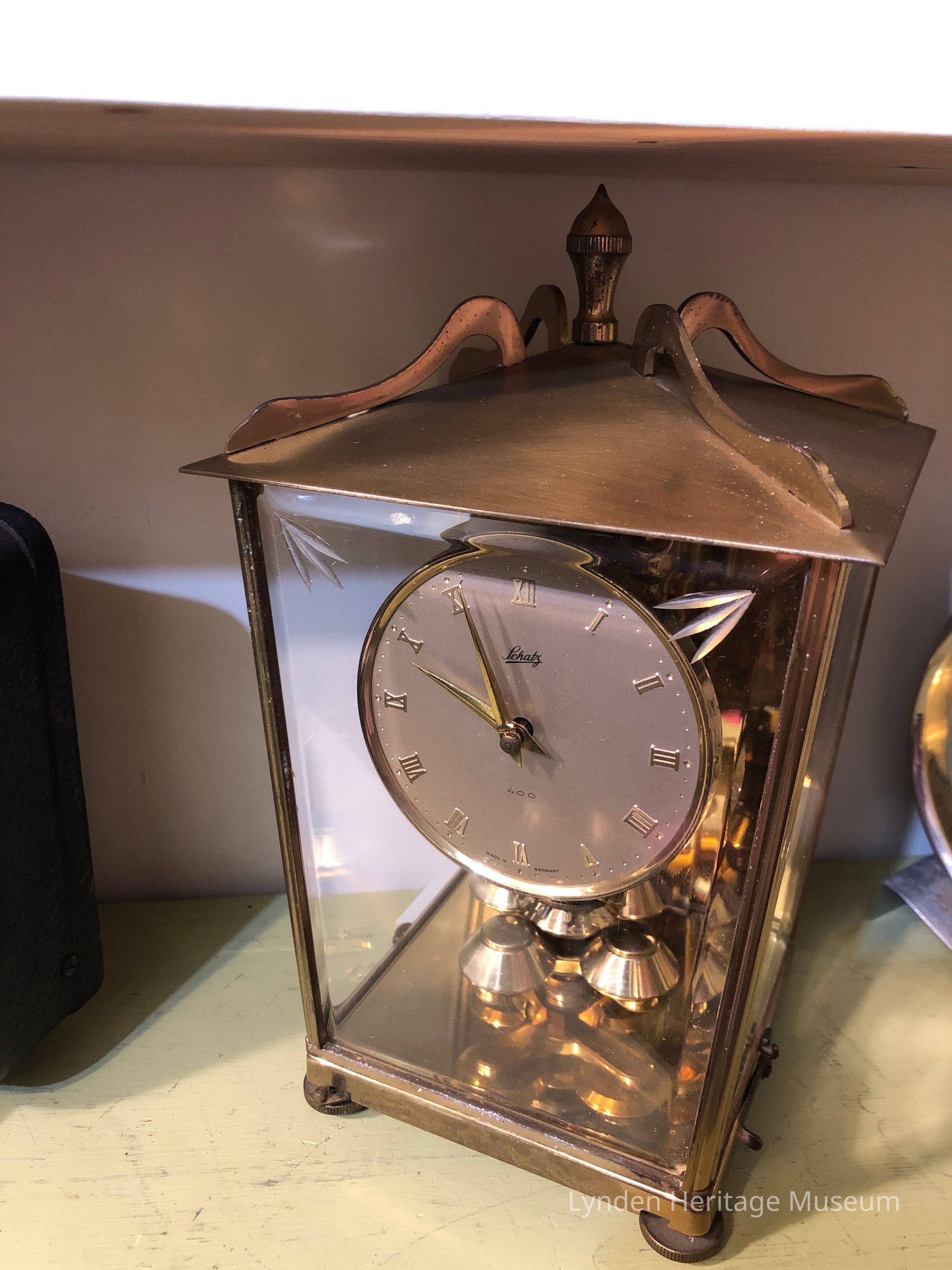 Gold clock encased in glass case with gold frame. Made in Germany.