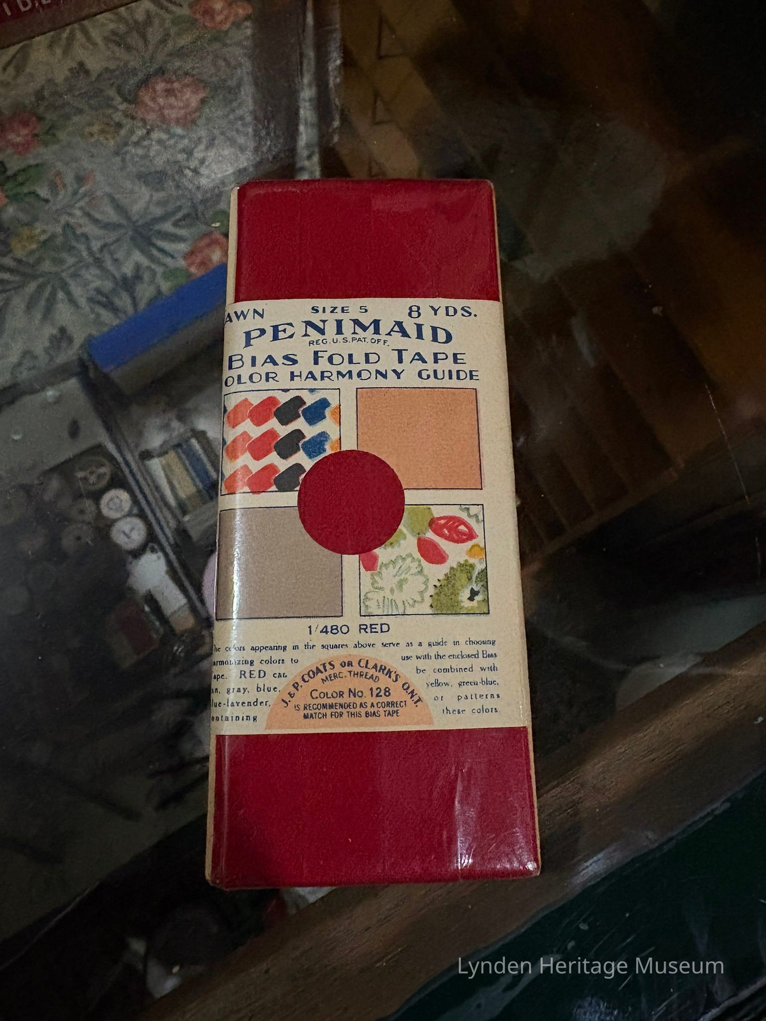 Red bias fold tape. Front label includes four boxes with illustrations. Center of the four boxes is a red square.