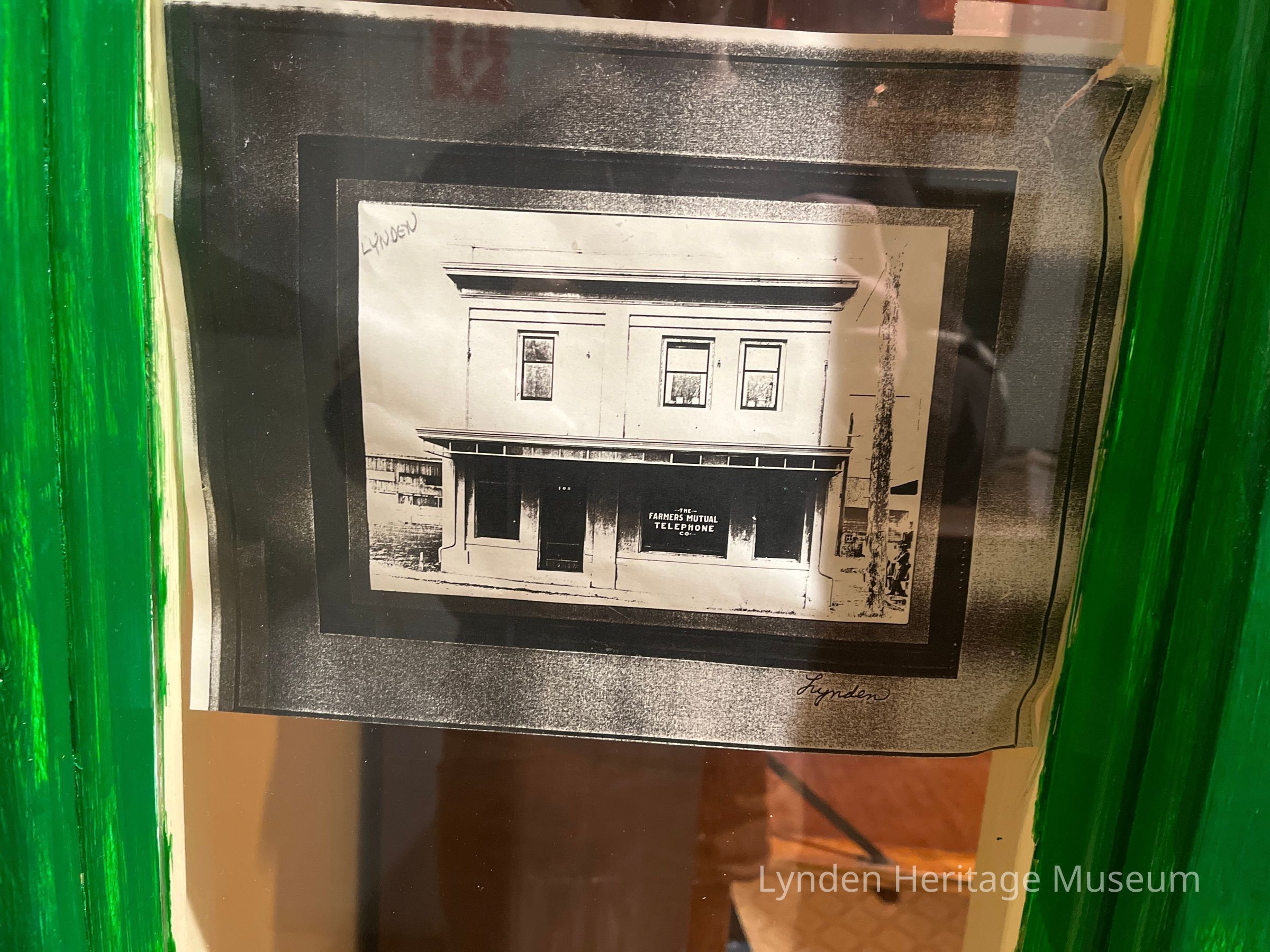 A black and white photo of a framed picture of The farmers mutual telephone co with Lynden written on the frame and original photographLocation