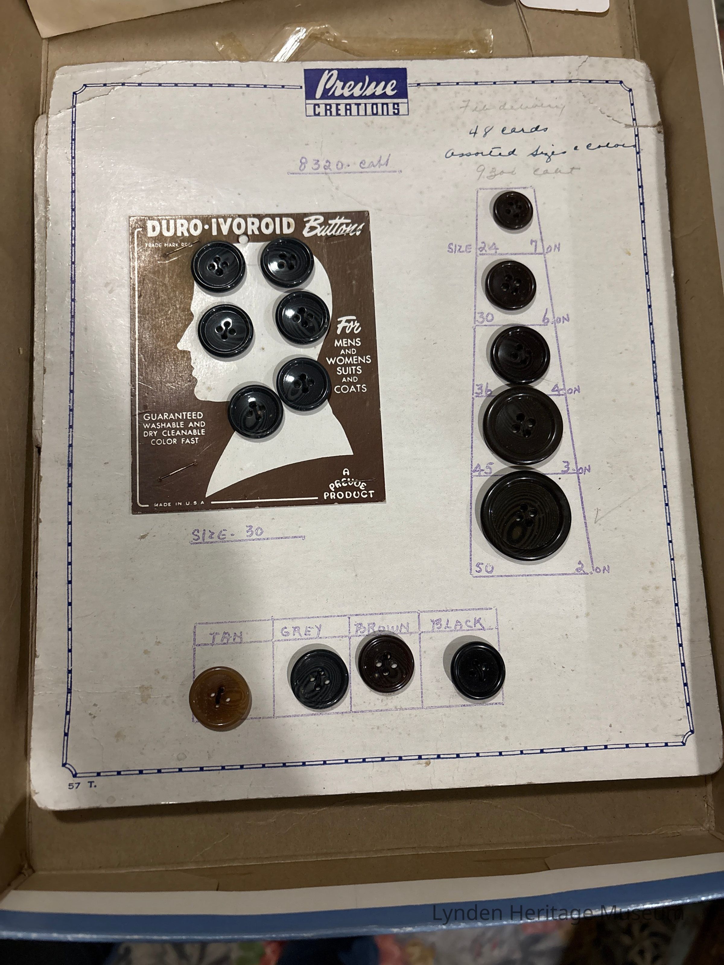 Sample includes a variety of black buttons in different sizes. Below sample includes tan, grey, and brown buttons.Category