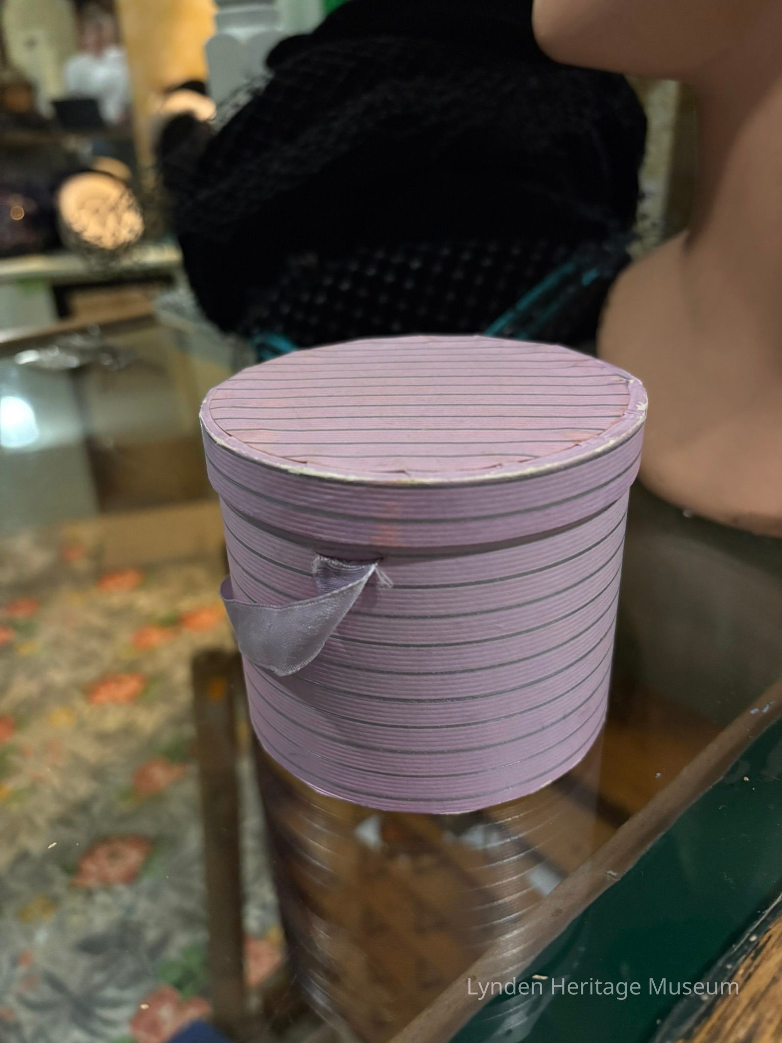 Container is purple with silver lines across the lid and body. Attached is silver fabric used as a strap.