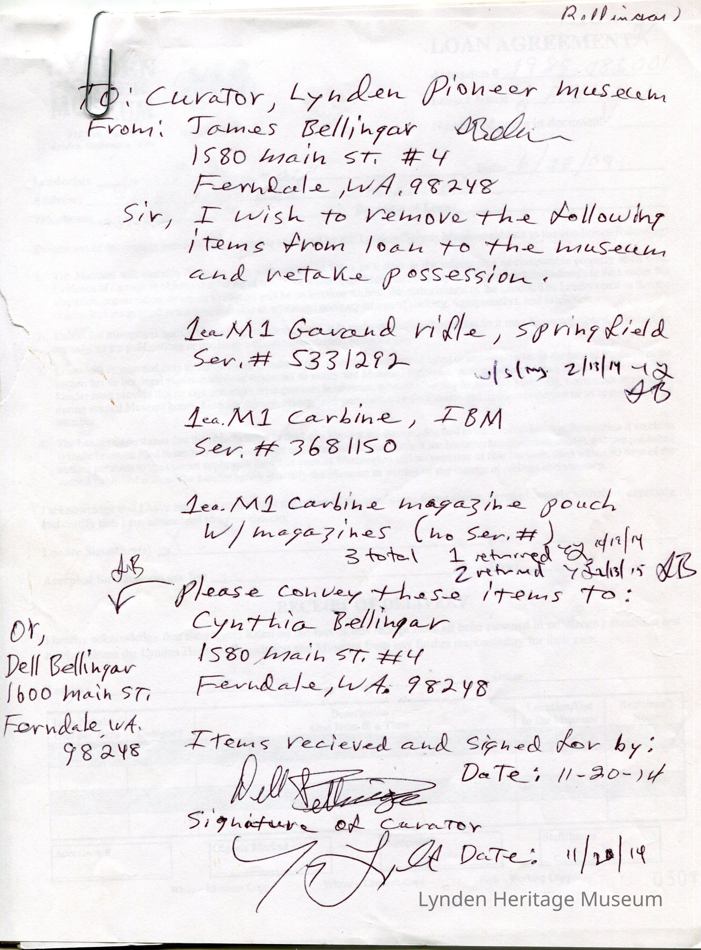 Request to Remove Items, Garand Springfield Rifle, M1 Carbine IBM, M1 Carbine Magazine Pouch