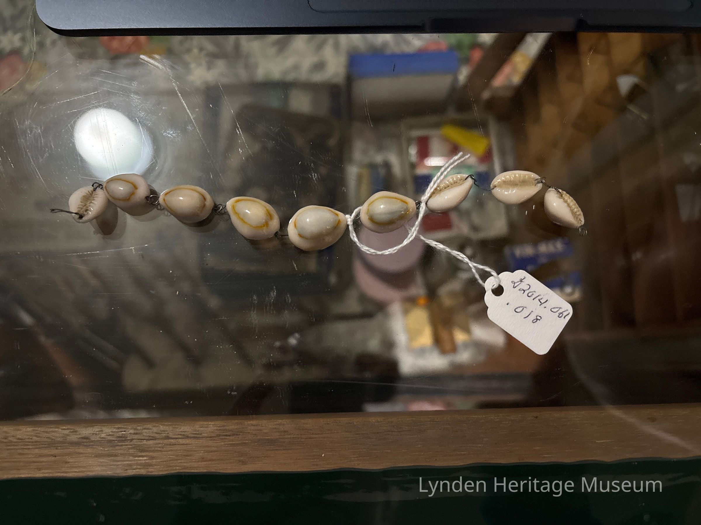 Nine white shells attached by metal wire.
