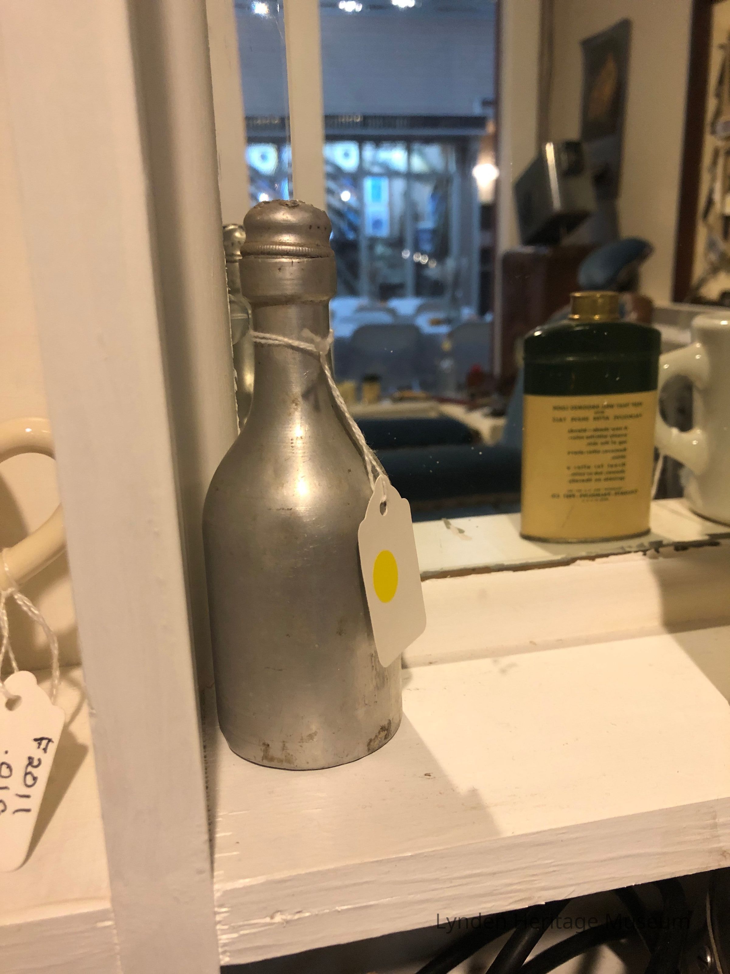 Silver container contains wide bass and narrow neck. Small holes on top with white substance inside.