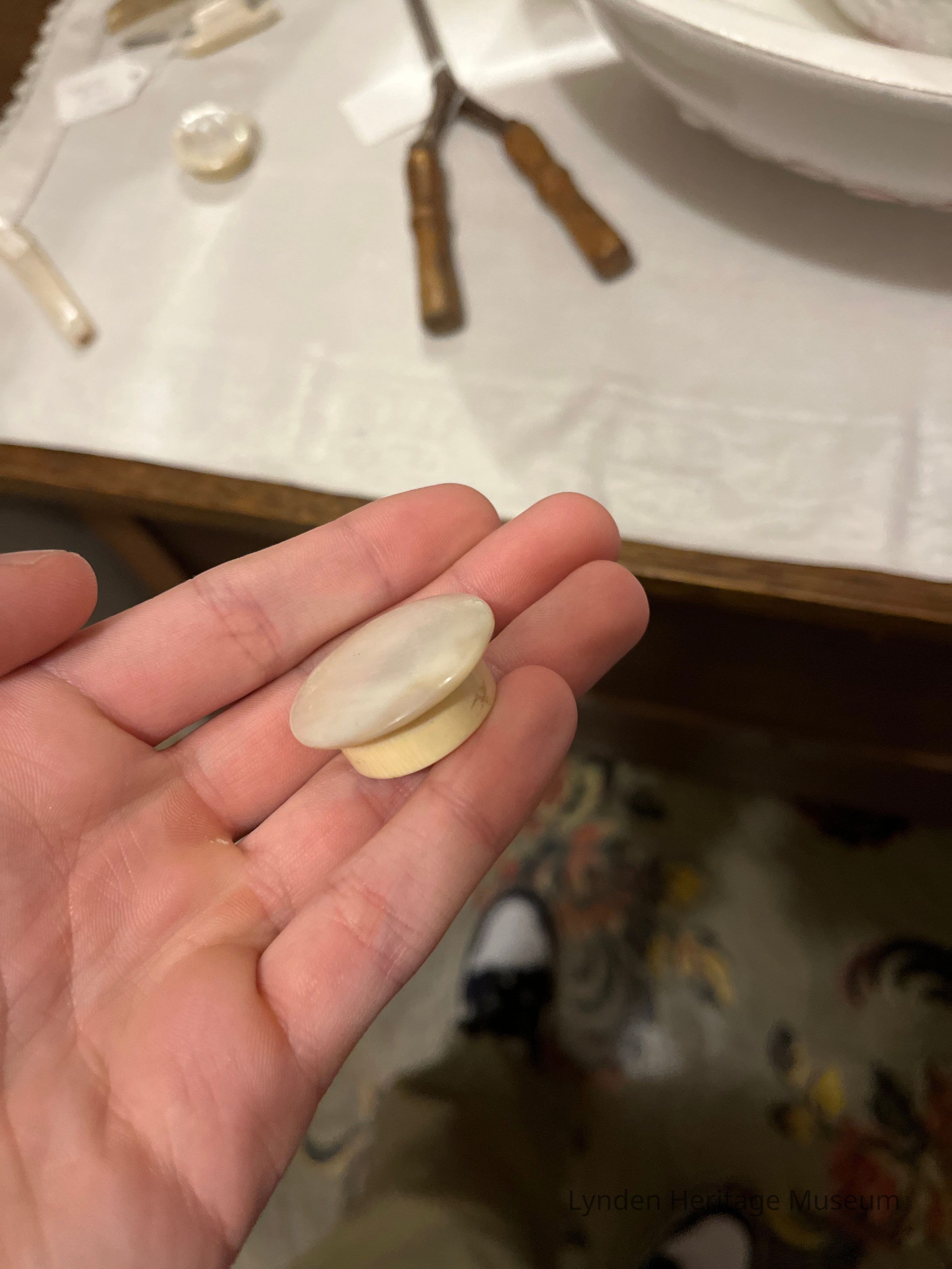 Small celluloid (vintage plastic) round vanity box with a mother of pearl lidCategory