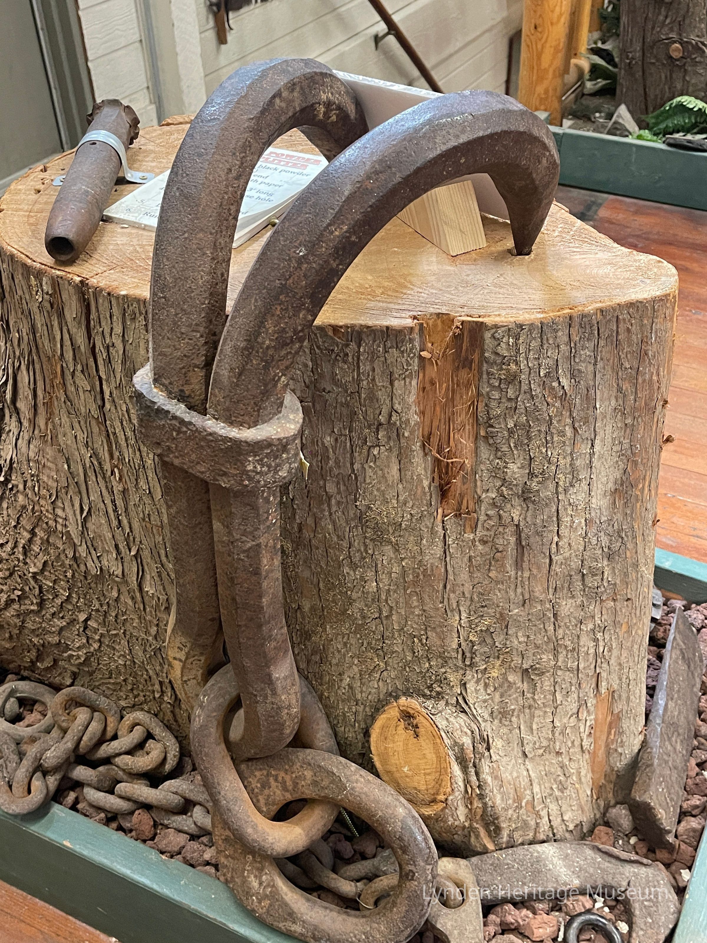 Used to split and pull tree stumps out from the ground. Were attached to a chain that was attached to horses.Context