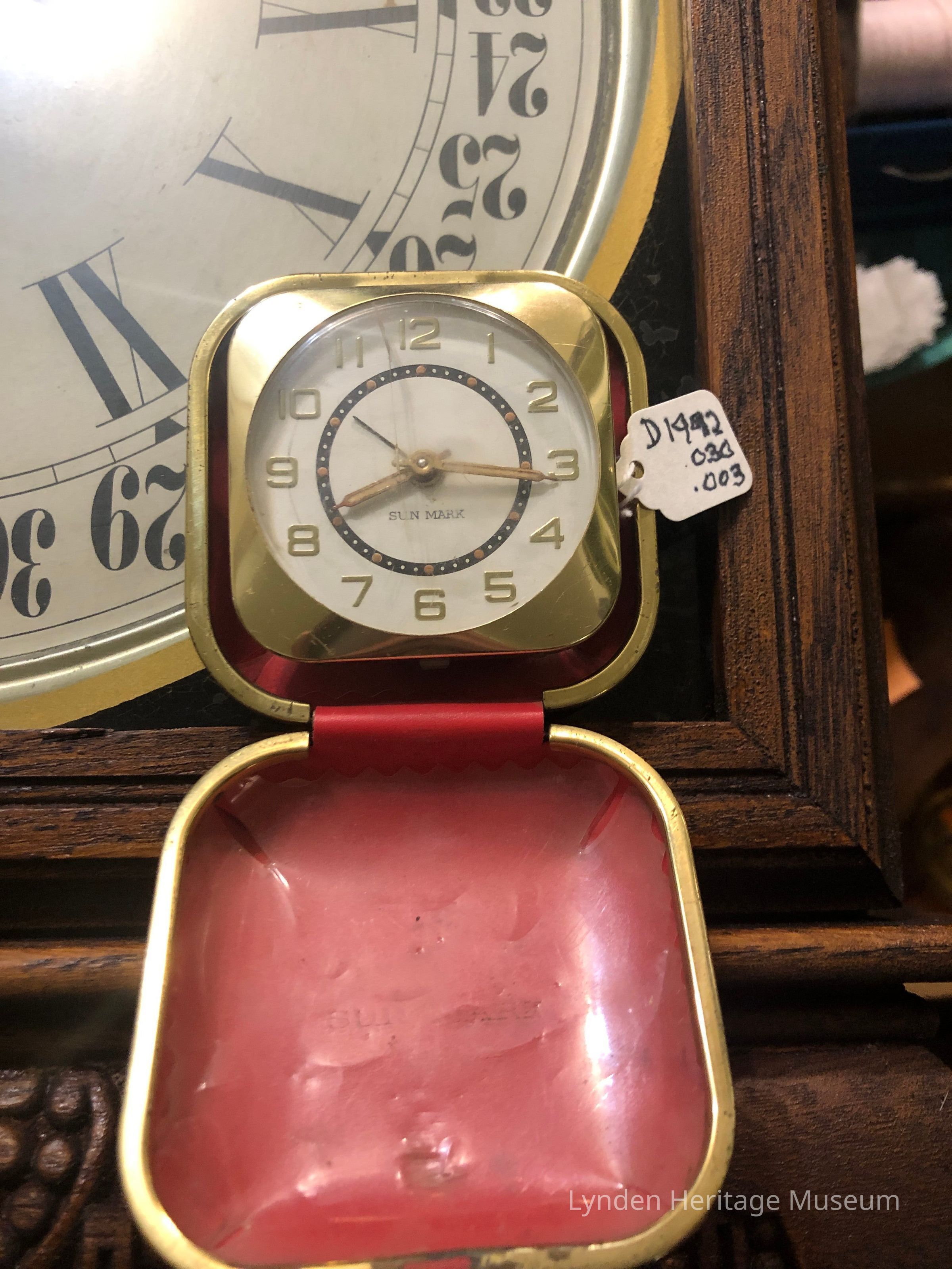 Red leather case. Gold frame and numbers.