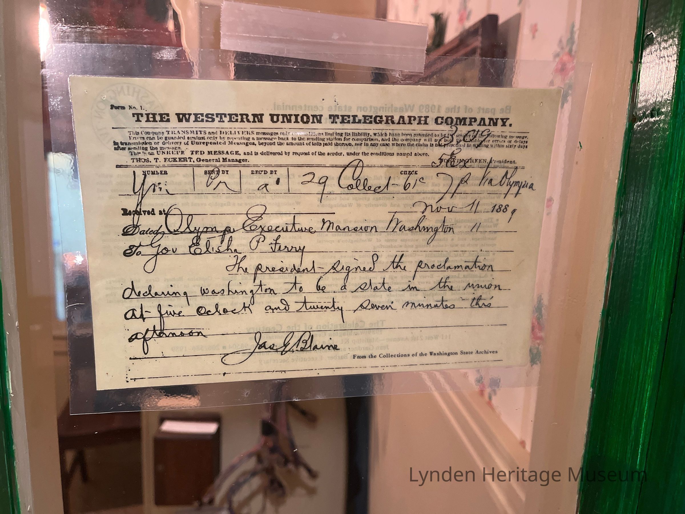 A telegram sent to Elisha P Ferry on Nov 11 1889 letting him know the president sign the proclamation declaring Washington a StateLocation