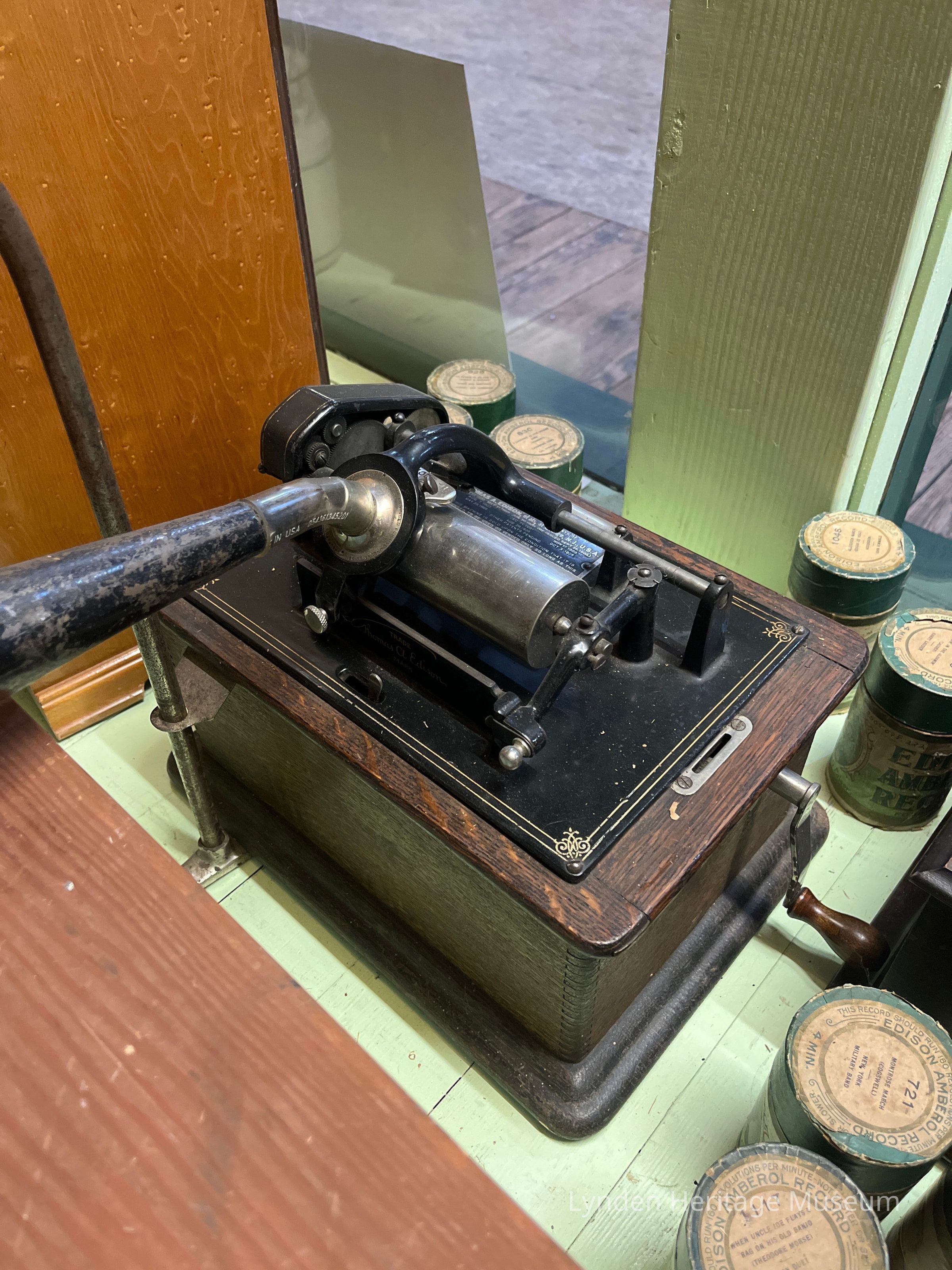 Has a large black horn attached. Wooden lid for the phonograph is present but not attached to the item itself