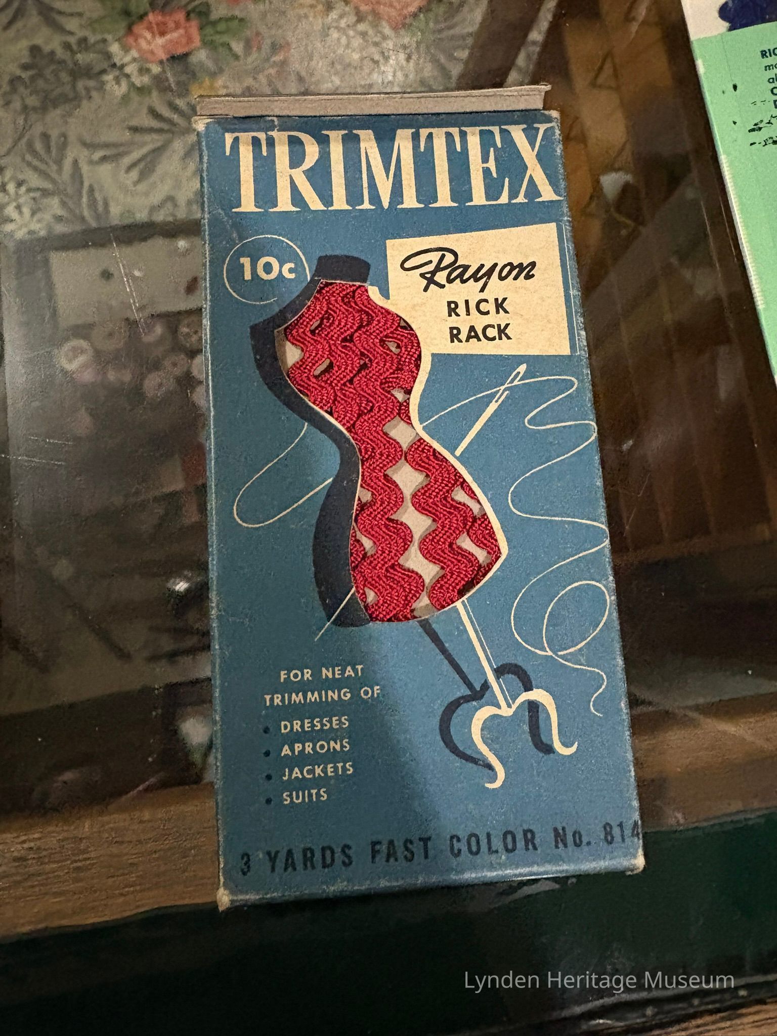 Box features a blue background with white and black text. Red zigzag fabric can be seen.Acquisition