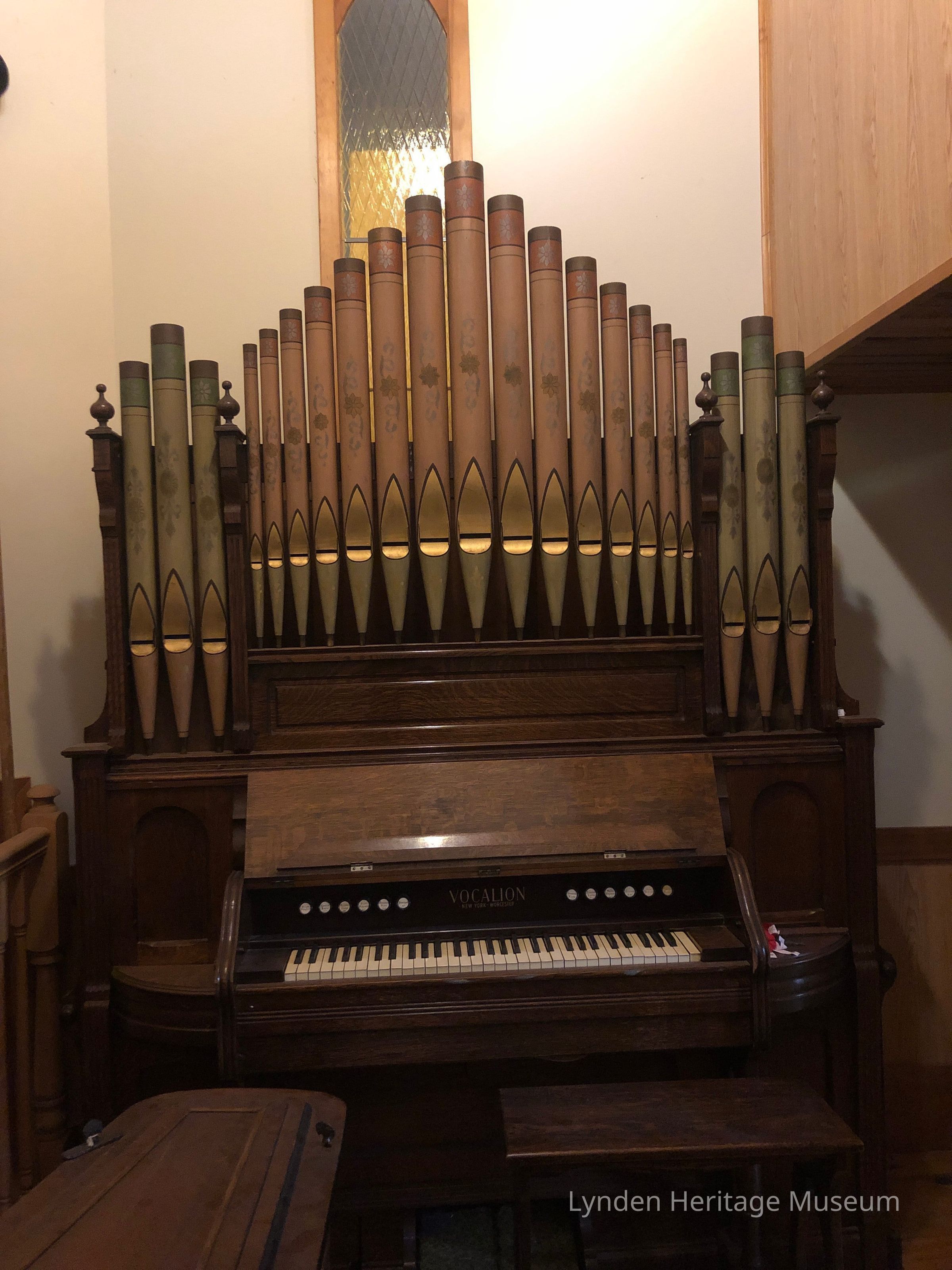 Vocalion Organ. Floral design on pipes. White buttons above keyboard.