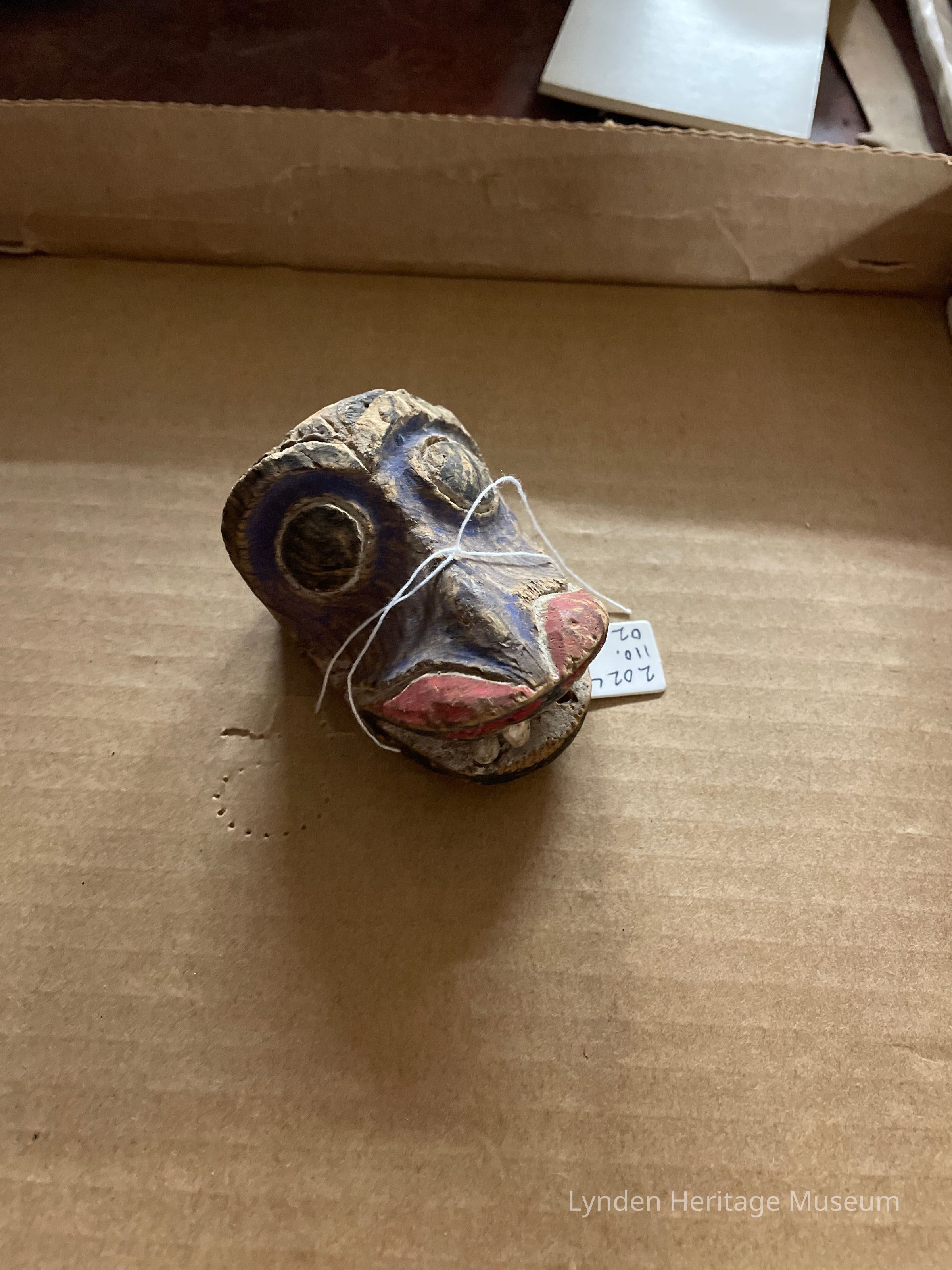 Blue, red, black eyes, 2 teeth left. 2.5” wide x 3.5” length
