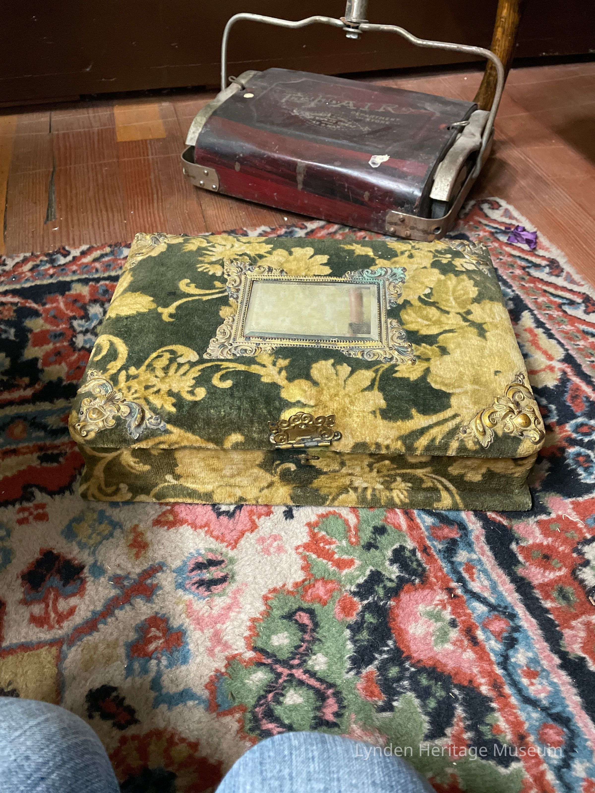 Jewelry/keepsake box, has mirror on lid, yellow metal detailing, in wood hutch
