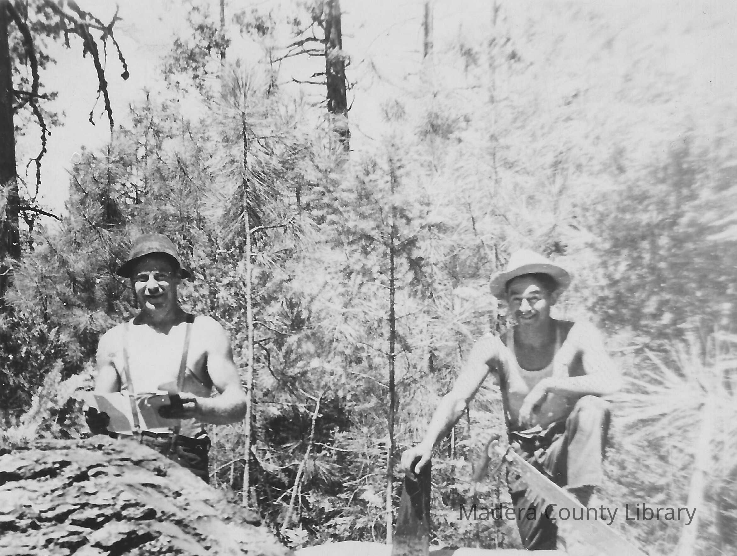 Dick Chartier and Eddie Polkenhorn are shown here working in the forests as loggers.Photograph Details