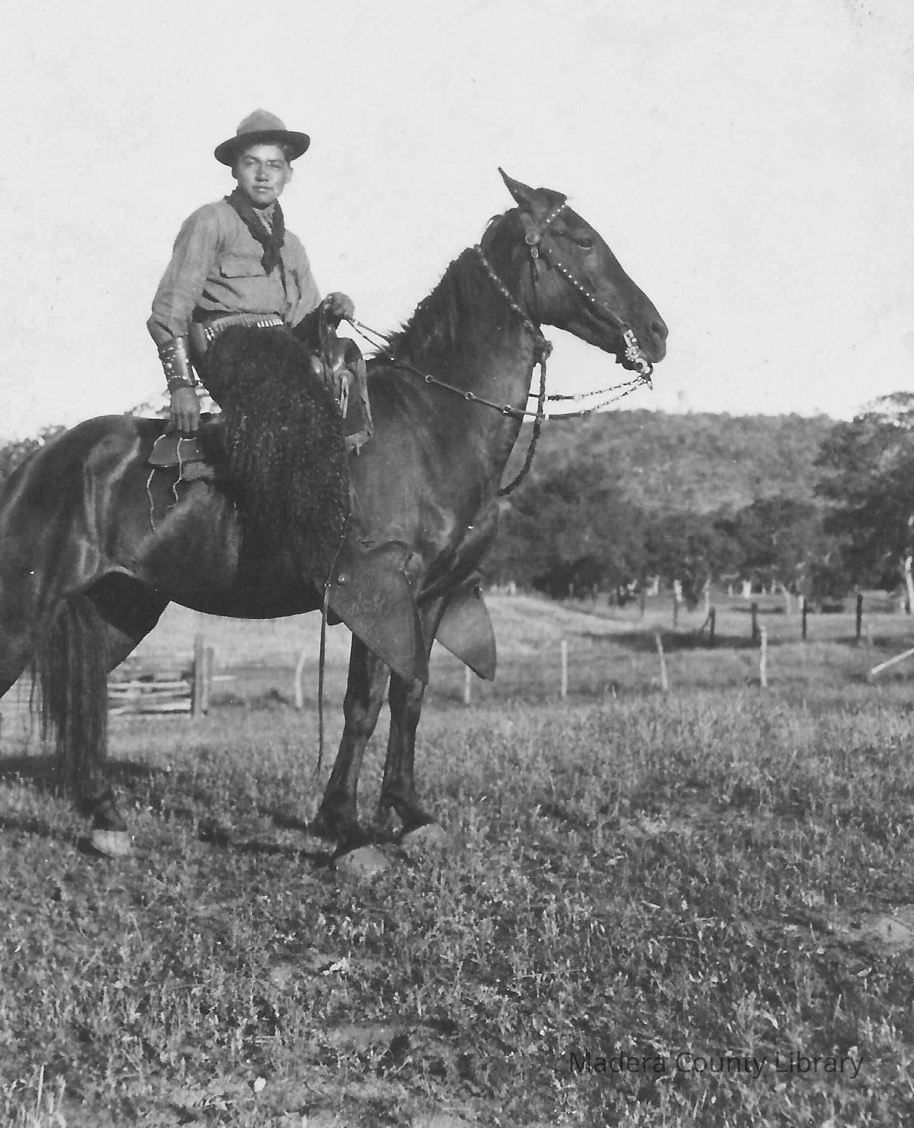 Lee Sherman, North Fork Mono Indian, is shown here on horseback in Madera County. In this photo, Lee wears "Woolies", chaps that were made from sheep's wool, leather western cuffs and "Tapaderos" on his stirrups. Many of the Indian cowboys had equipment that was of the finest quality, often making it themselves.Photograph Details