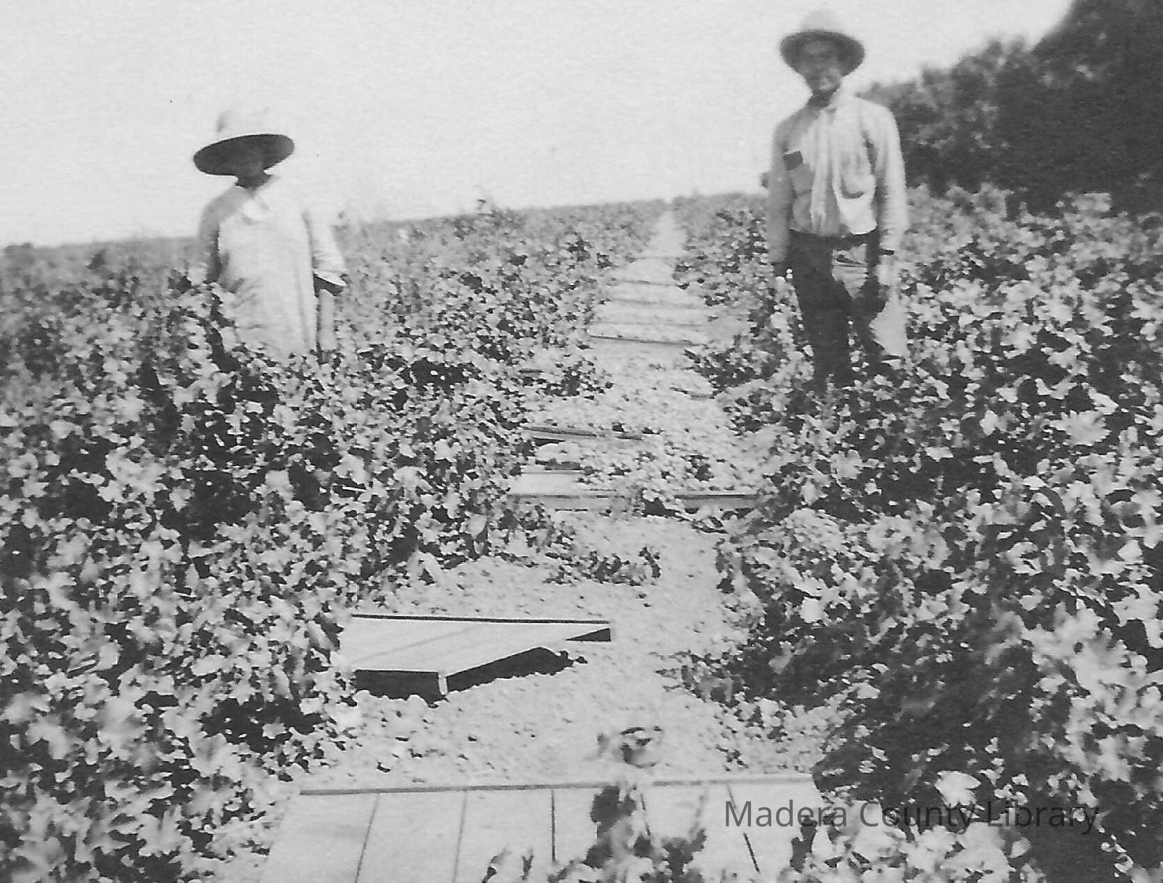 Frances Sherman-Polkenhorn and Sam Polkenhorn, Jr. working in the grape fields of Madera County. After the Lumber season was over, many Indian families would work as migrant farm workers in the summer picking grapes. For example, in this photo, Frances and Sam would pick grapes and then put them on wooden trays to dry in the sun, which would result in the grapes becoming raisins..Photograph Details