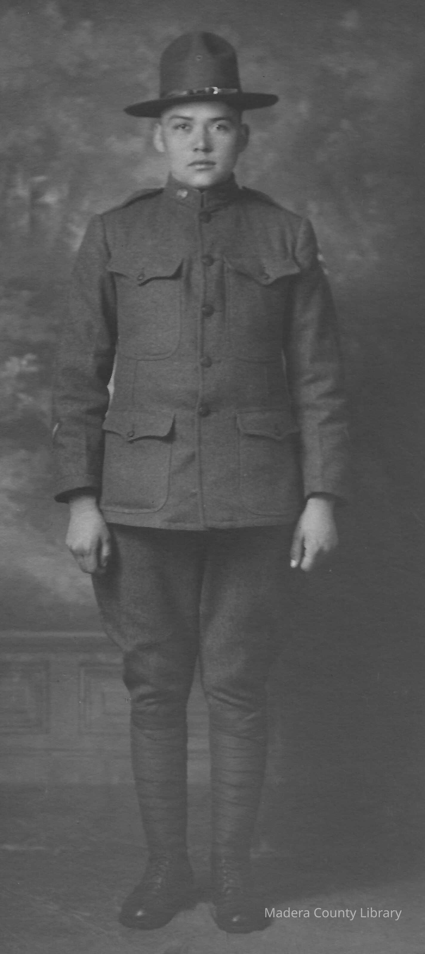 Lee Sherman, North Fork Mono Indian, is shown here in his World War I Uniform. Lee served in the United States Army. California Indians were not considered United States Citizens until 1924, however, if they served in the Military they were granted automatic citizenship.Photograph Details