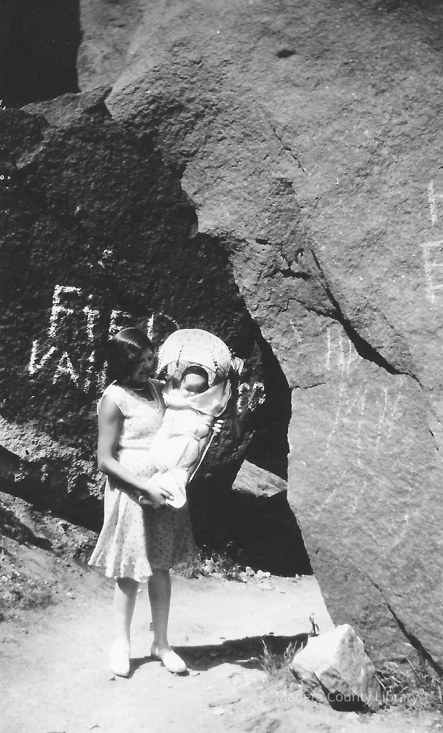 Lapena Bethel holding an Unidentified baby in a cave near Yosemite National Park.