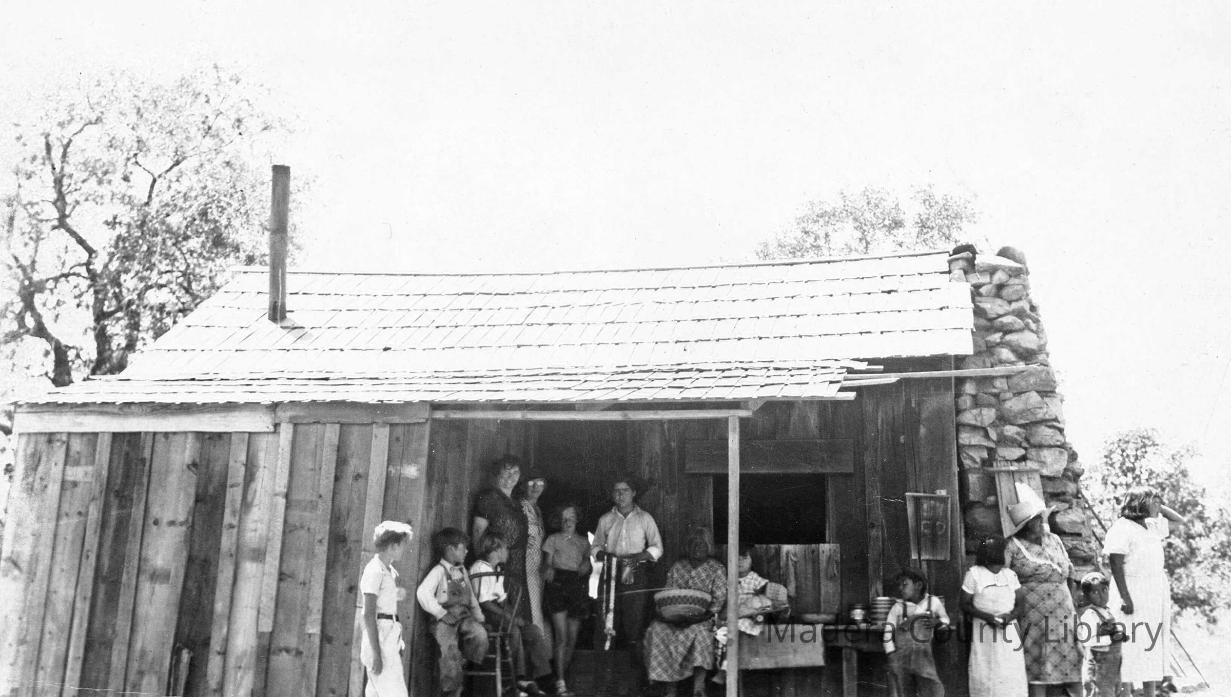 Mollie Kinsman-Pomona's home in North Fork, Madera County. Mollie is shown in the center of the photograph, sitting on a chair holding a basket.Photograph Details