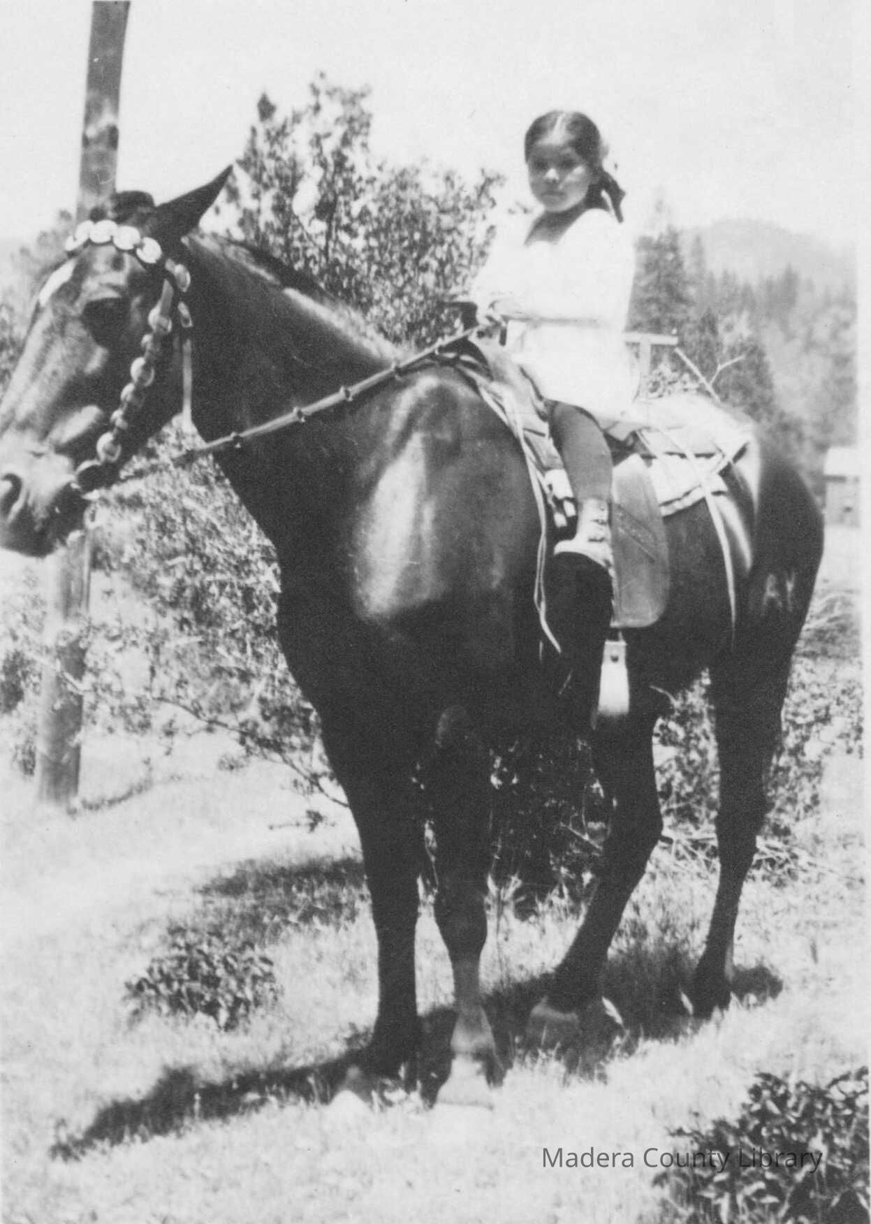 Unidentified North Fork Mono girl is shown riding her horse. Notice the beautiful head stall the horse is wearing, and the brand "AK" (Annie Kinsman)on the back left leg of her horse.Photograph Details