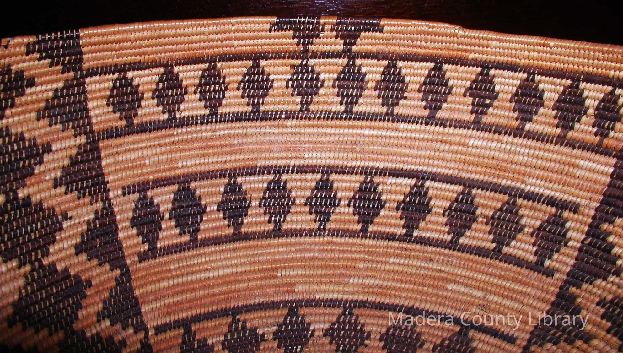 Decorative basket, Weaver is unknown. Design is a vertical snake inspired design with a horizontal diamond pattern. Materials: Sedge Root and dyed Bracken Fern on a Deer Grass foundation. Height: 4 1/2", Width: 7". This basket is included in the Native American Indian Basket Collection at the Madera County Historical Museum.Photograph Details