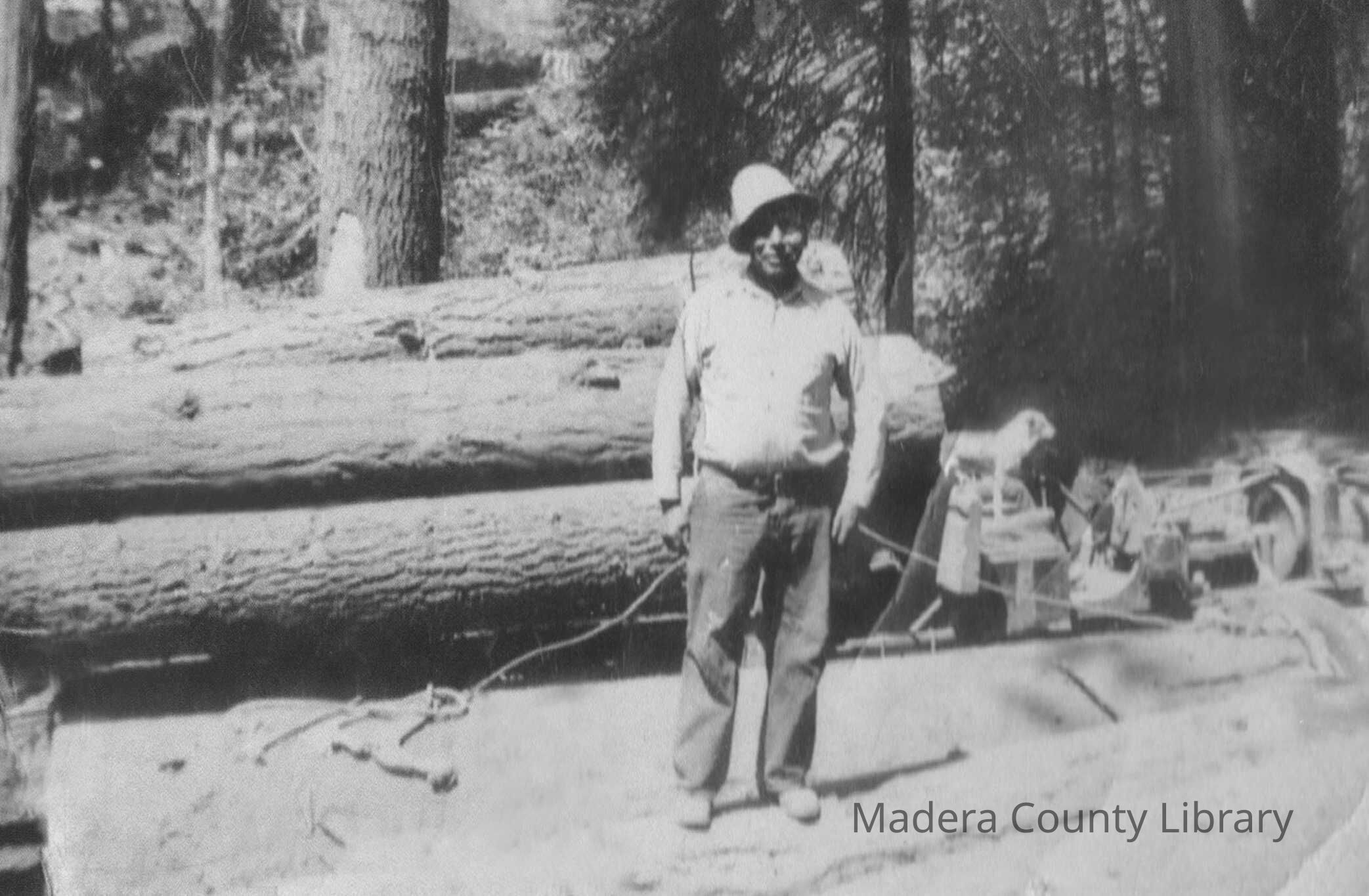 Charlie Alec working for Bretz Brothers at Shaver Lake, 1938. Both Charlie and his brother, Willie, helped clear trees for the dam to be built.Photograph Details