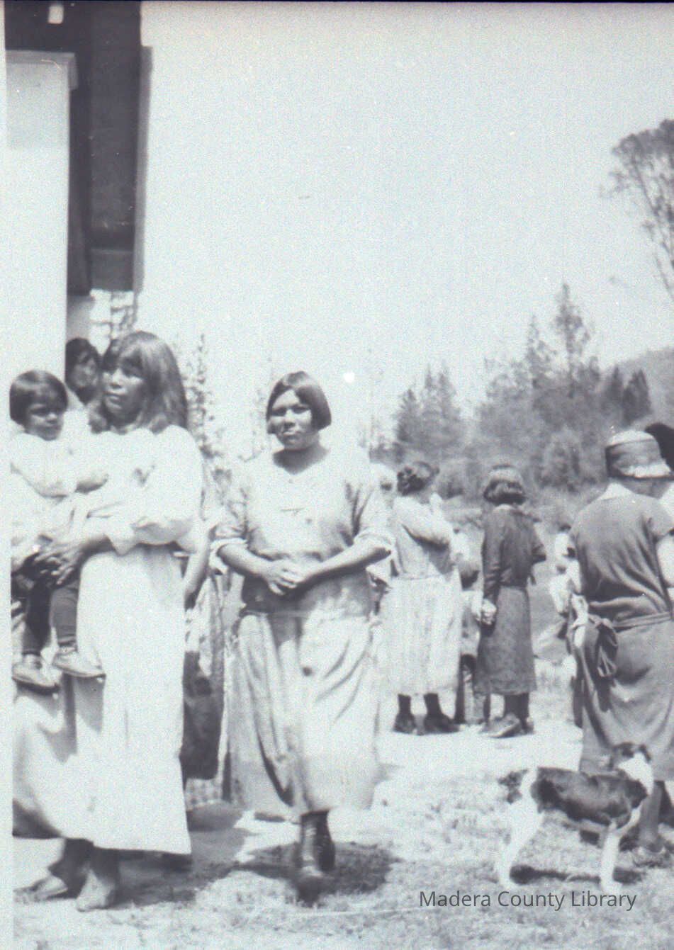 Lizzie Moore is shown here holding her granddaughter Ethel, with her daughter Daisy behind her. This photo was taken at church in North Fork, Madera County, California.Photograph Details