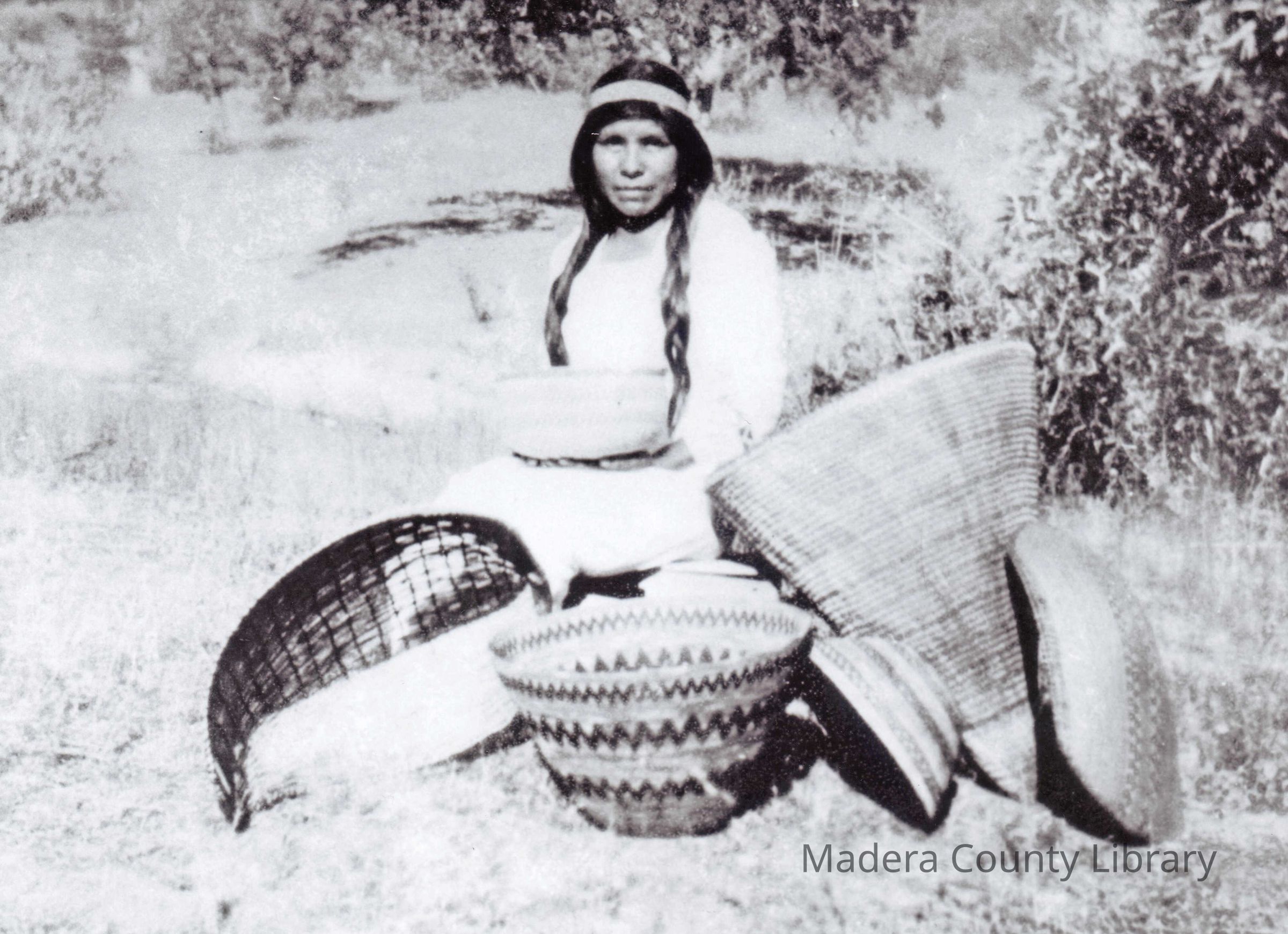 Emma Moore-Pomona. a North Fork Mono woman, is shown here among some of the baskets she made. She was known for a style of basket, the "Shoe Basket", of which a photo of one of her baskets is included in the Native American Collection. Emma was married to Willie Pomona and they had 3 daughters; Ethel, Ruby and Jane. Emma, along withf her daughters, contracted Tuberculosis in the early 1930's. Ethel and Ruby were sent to Fort Bidwell's Tuberculosis Sanitarium during which time both Emma and Jane died of the disease.Photograph Details
